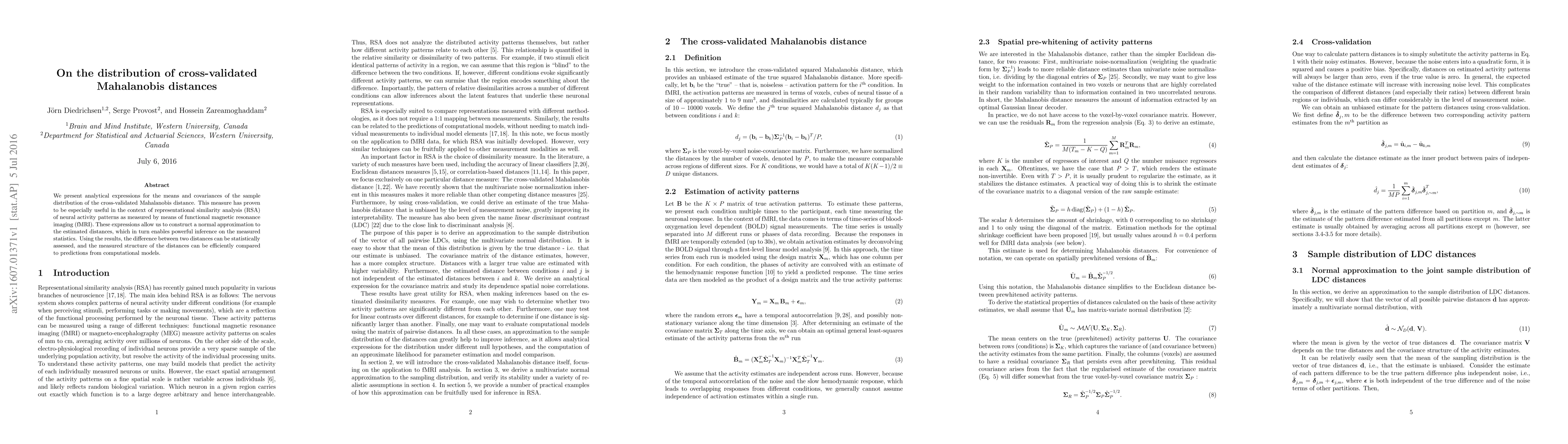 This paper provides analytical expressions for the means and covariances of the cross-validated Mahalanobis distance, facilitating powerful statistical inference in representational similarity analysis (RSA) of fMRI data. The derived normal approximation enables efficient comparison of measured neural activity patterns to computational model predictions.