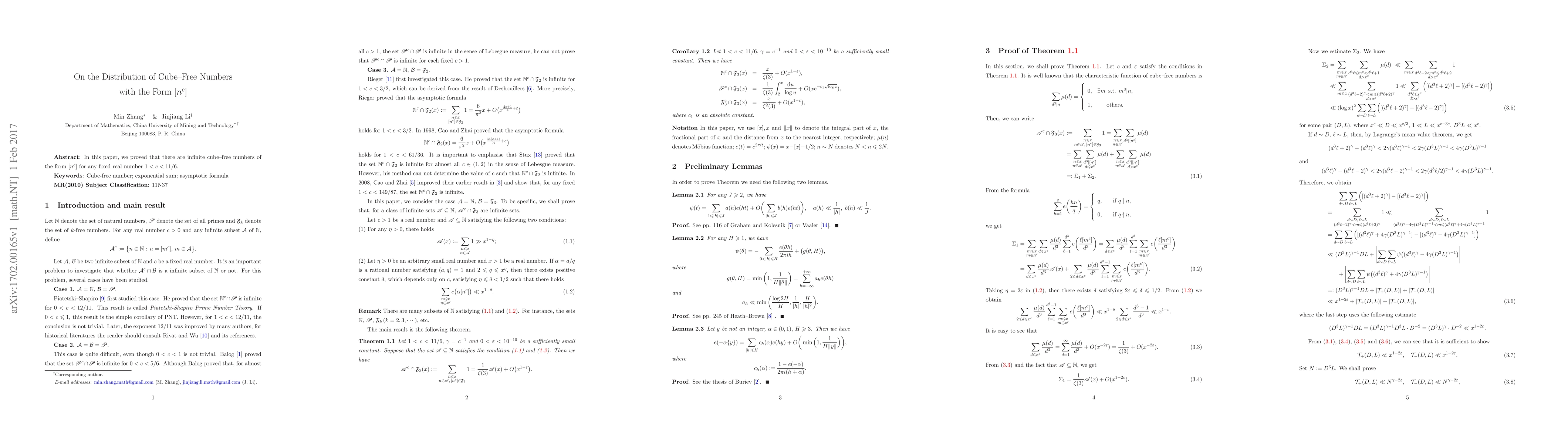 Researchers proved that there are infinite cube-free numbers of the form $[n^c]$ for real number $1<c<11/6$, expanding our understanding of these special numbers.