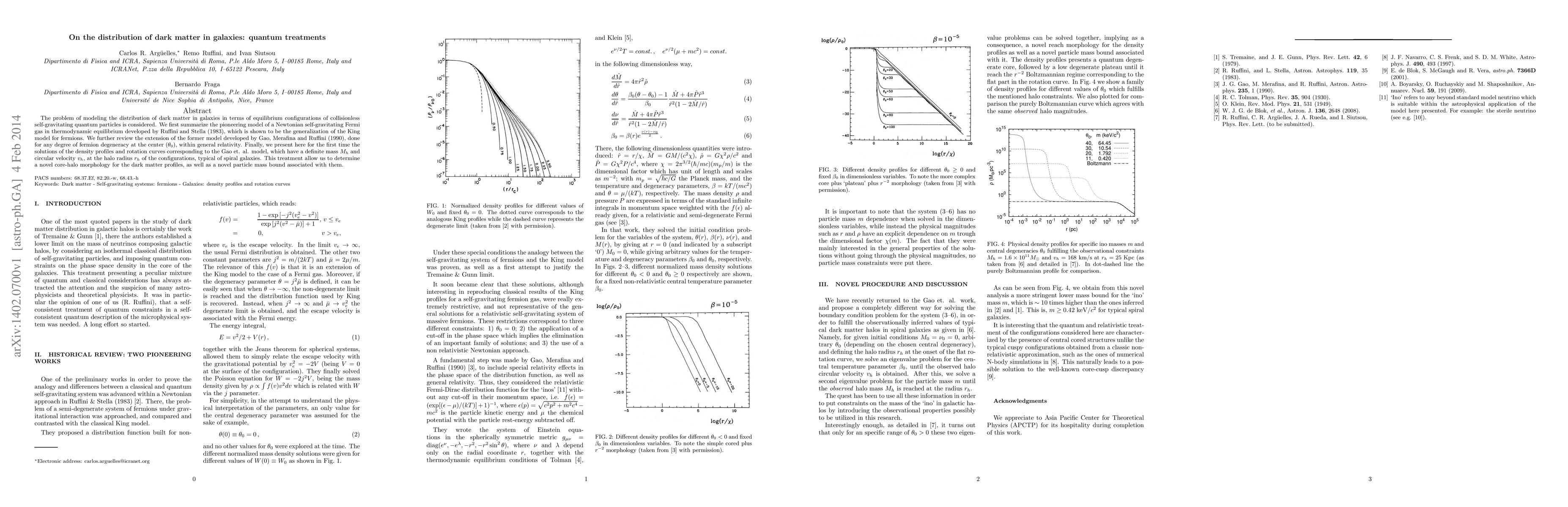 The problem of modeling the distribution of dark matter in galaxies in terms of equilibrium configurations of collisionless self-gravitating quantum particles is considered. We first summarize the pioneering model of a Newtonian self-gravitating Fermi gas in thermodynamic equilibrium developed by Ruffini and Stella (1983), which is shown to be the generalization of the King model for fermions. We further review the extension of the former model developed by Gao, Merafina and Ruffini (1990), done for any degree of fermion degeneracy at the center ($\theta_0$), within general relativity. Finally, we present here for the first time the solutions of the density profiles and rotation curves corresponding to the Gao et. al. model, which have a definite mass $M_h$ and circular velocity $v_h$, at the halo radius $r_h$ of the configurations, typical of spiral galaxies. This treatment allow us to determine a novel core-halo morphology for the dark matter profiles, as well as a novel particle mass bound associated with them.