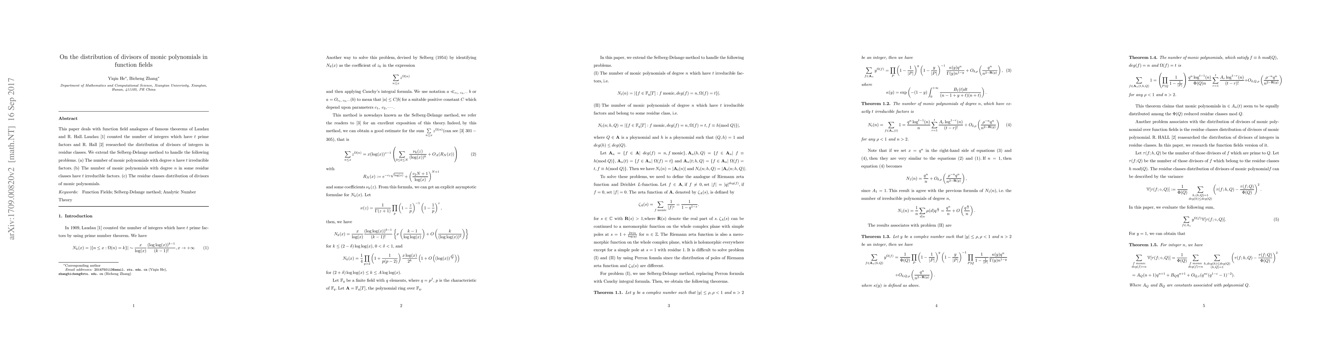 This paper extends the Selberg-Delange method to study the distribution of divisors in function fields, focusing on monic polynomials with a specific number of irreducible factors and their residue classes.