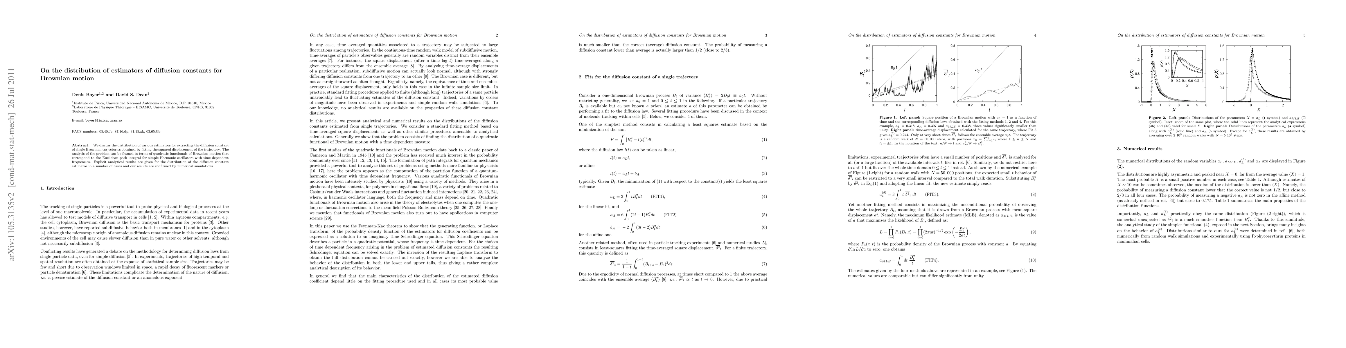 We discuss the distribution of various estimators for extracting the diffusion constant of single Brownian trajectories obtained by fitting the squared displacement of the trajectory. The analysis of the problem can be framed in terms of quadratic functionals of Brownian motion that correspond to the Euclidean path integral for simple Harmonic oscillators with time dependent frequencies. Explicit analytical results are given for the distribution of the diffusion constant estimator in a number of cases and our results are confirmed by numerical simulations.