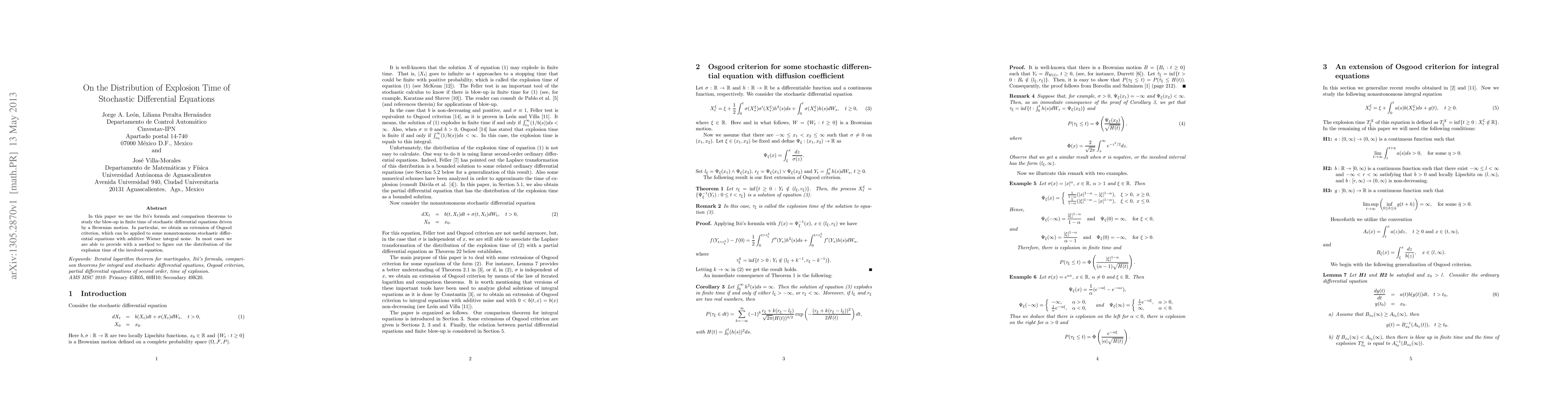 This paper uses stochastic differential equations to study the distribution of explosion time in finite time, providing a method to determine when these equations blow up in time. It extends an existing criterion for nonautonomous equations with additive Wiener integral noise, offering insights into controlled outcomes.
