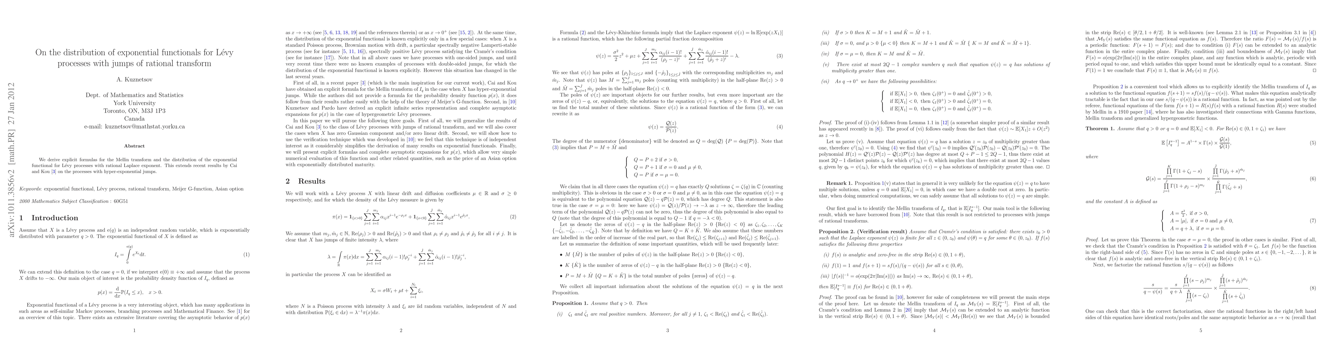 We derive explicit formulas for the Mellin transform and the distribution of the exponential functional for Levy processes with rational Laplace exponent. This extends recent results by Cai and Kou on the processes with hyper-exponential jumps [N. Cai and S. Kou "Prising Asian options under a general jump diffusion model", (2010)].