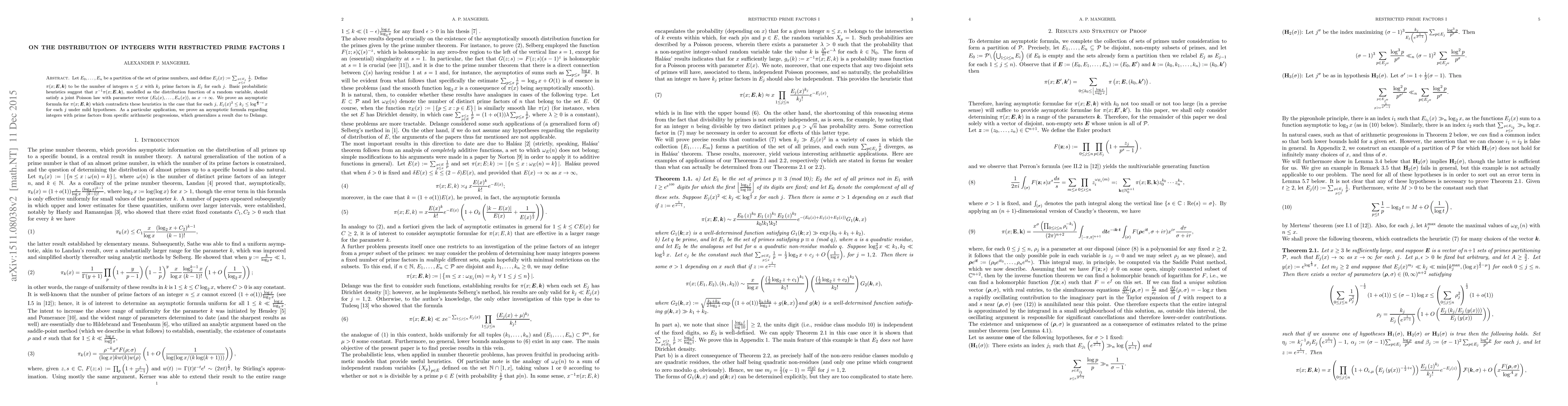 This paper investigates the distribution of integers with restricted prime factors, proving an asymptotic formula for $\pi(x;\mathbf{E},\mathbf{k})$ that contradicts basic probabilistic heuristics under certain conditions. It also provides a generalization for integers with prime factors from specific arithmetic progressions.
