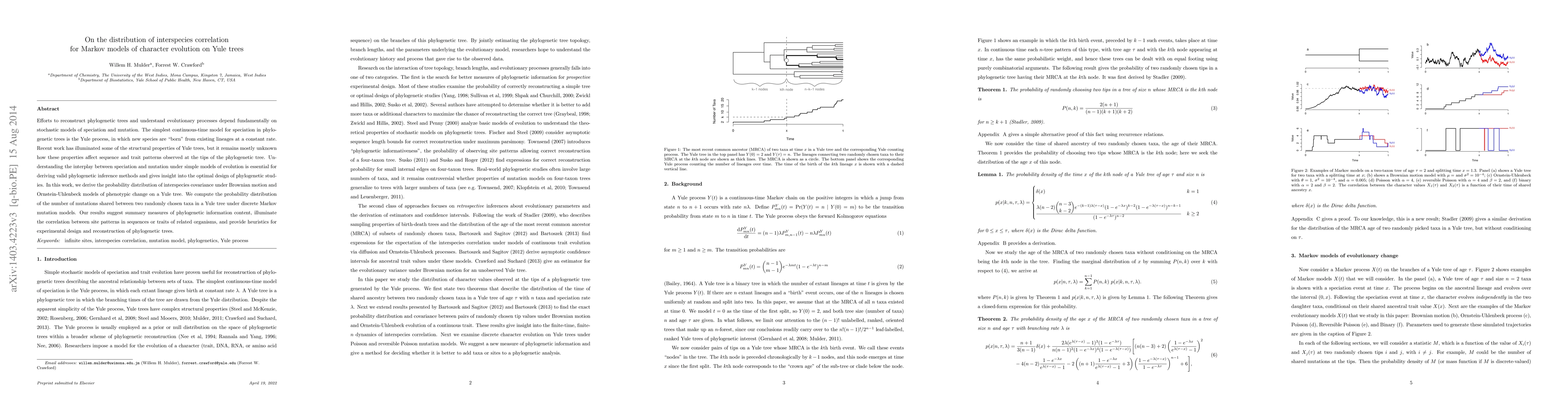 This paper derives the probability distribution of interspecies covariance for Markov models of character evolution on Yule trees, providing insights into the correlation between traits and sequence patterns in phylogenetic studies. It also computes the distribution of shared mutations in a Yule tree, offering heuristics for phylogenetic inference and experimental design.