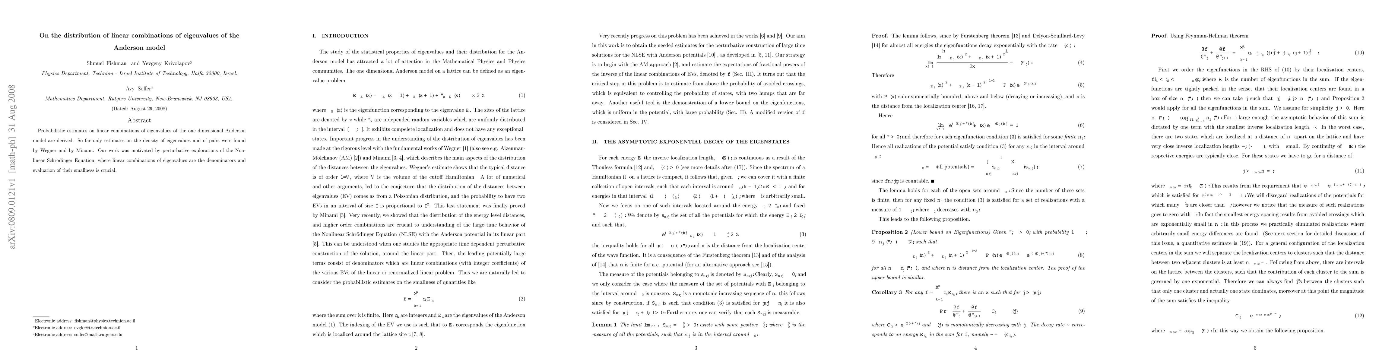 Probabilistic estimates on linear combinations of eigenvalues of the one dimensional Anderson model are derived. So far only estimates on the density of eigenvalues and of pairs were found by Wegner and by Minami. Our work was motivated by perturbative explorations of the Nonlinear Schroedinger Equation, where linear combinations of eigenvalues are the denominators and evaluation of their smallness is crucial.