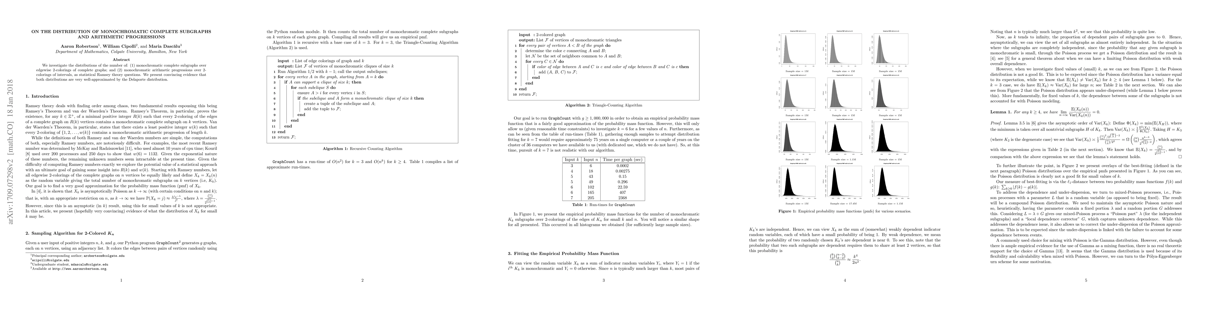 This paper examines the distribution of monochromatic complete subgraphs in 2-colorings of complete graphs and monochromatic arithmetic progressions in 2-colorings of intervals, finding both distributions closely approximated by the Delaporte distribution.
