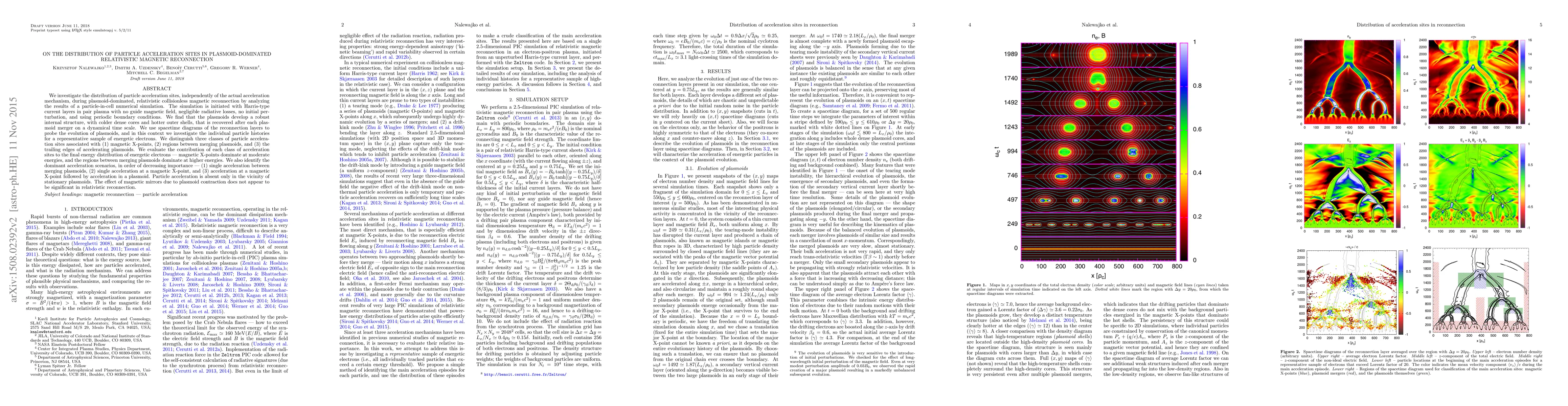 We investigate the distribution of particle acceleration sites, independently of the actual acceleration mechanism, during plasmoid-dominated, relativistic collisionless magnetic reconnection by analyzing the results of a particle-in-cell numerical simulation. The simulation is initiated with Harris-type current layers in pair plasma with no guide magnetic field, negligible radiative losses, no initial perturbation, and using periodic boundary conditions. We find that the plasmoids develop a robust internal structure, with colder dense cores and hotter outer shells, that is recovered after each plasmoid merger on a dynamical time scale. We use spacetime diagrams of the reconnection layers to probe the evolution of plasmoids, and in this context we investigate the individual particle histories for a representative sample of energetic electrons. We distinguish three classes of particle acceleration sites associated with (1) magnetic X-points, (2) regions between merging plasmoids, and (3) the trailing edges of accelerating plasmoids. We evaluate the contribution of each class of acceleration sites to the final energy distribution of energetic electrons -- magnetic X-points dominate at moderate energies, and the regions between merging plasmoids dominate at higher energies. We also identify the dominant acceleration scenarios, in order of decreasing importance -- (1) single acceleration between merging plasmoids, (2) single acceleration at a magnetic X-point, and (3) acceleration at a magnetic X-point followed by acceleration in a plasmoid. Particle acceleration is absent only in the vicinity of stationary plasmoids. The effect of magnetic mirrors due to plasmoid contraction does not appear to be significant in relativistic reconnection.