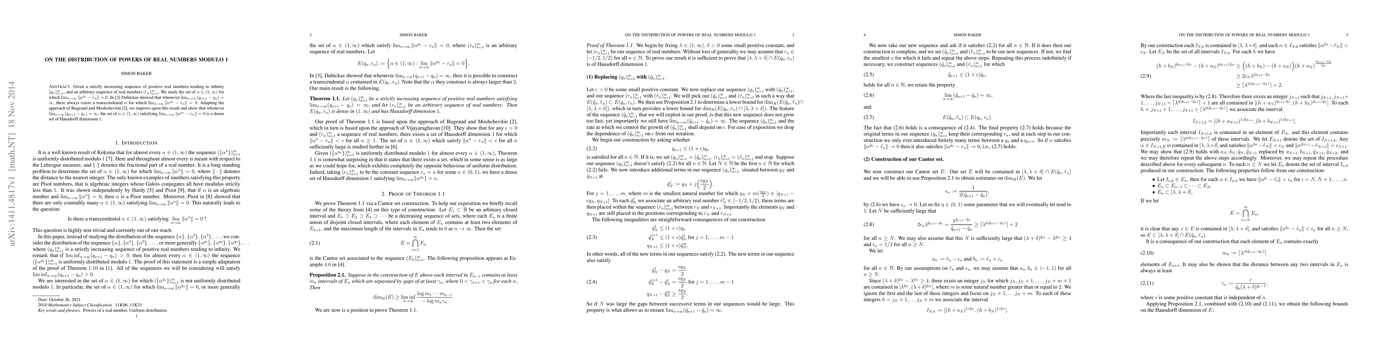 Researchers study how powers of real numbers behave modulo 1 under certain conditions, finding that a dense set of Hausdorff dimension 1 satisfies the condition for convergence.
