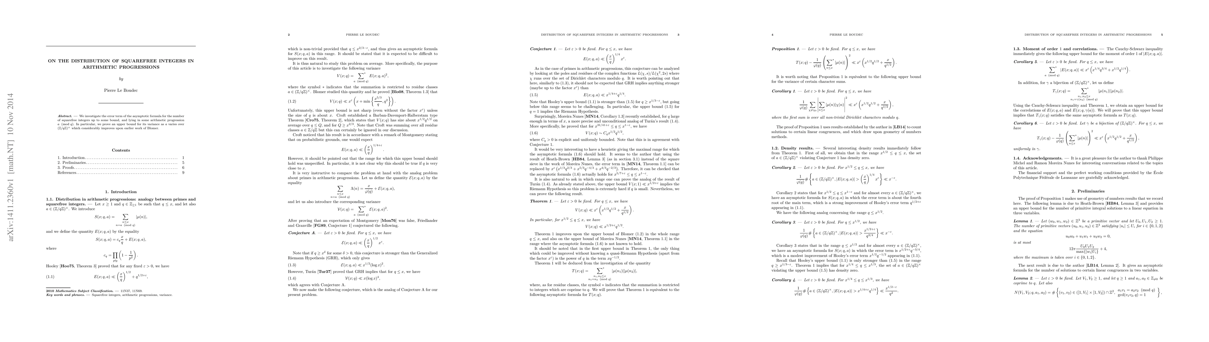 This paper studies the error term in the asymptotic count of squarefree integers within arithmetic progressions, achieving a significant improvement in the upper bound of its variance compared to previous research by Blomer.