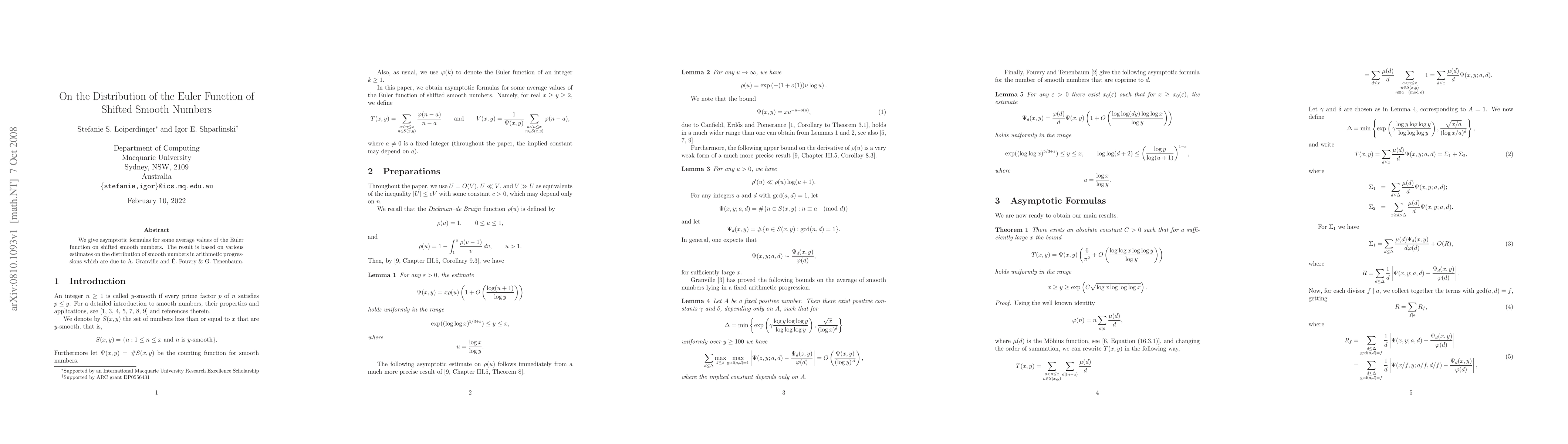 We give asymptotic formulas for some average values of the Euler function on shifted smooth numbers. The result is based on various estimates on the distribution of smooth numbers in arithmetic progressions which are due to A. Granville and \'E. Fouvry & G. Tenenbaum.