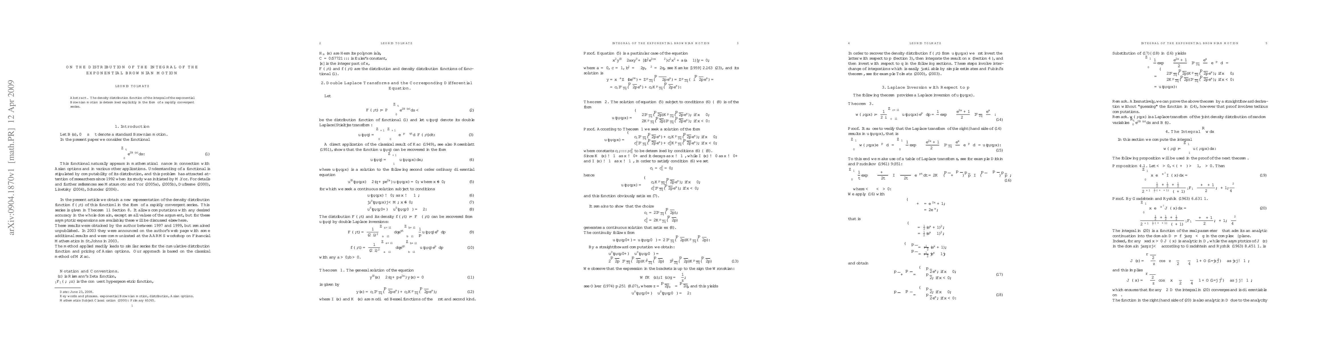 The density distribution function of the integral of the exponential Brownian motion is determined explicitly in the form of a rapidly convergent series.