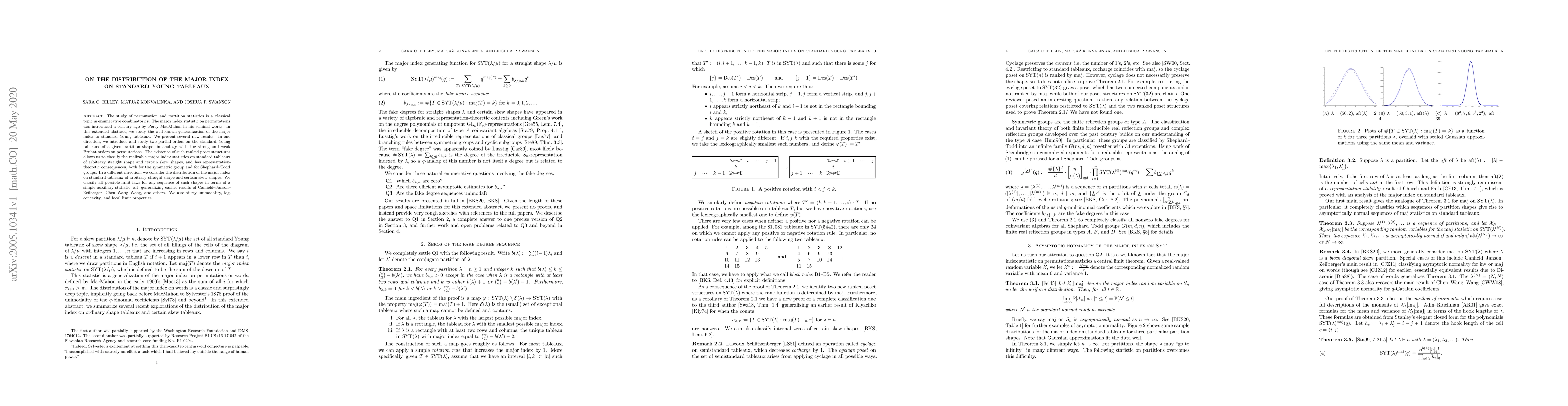 This paper explores the distribution and properties of the major index statistic on standard Young tableaux, introducing two new partial orders on these tableaux. It classifies the major index statistics across various shapes and identifies limit laws, contributing to representation theory for symmetric and Shephard-Todd groups, while also studying unimodality and log-concavity.