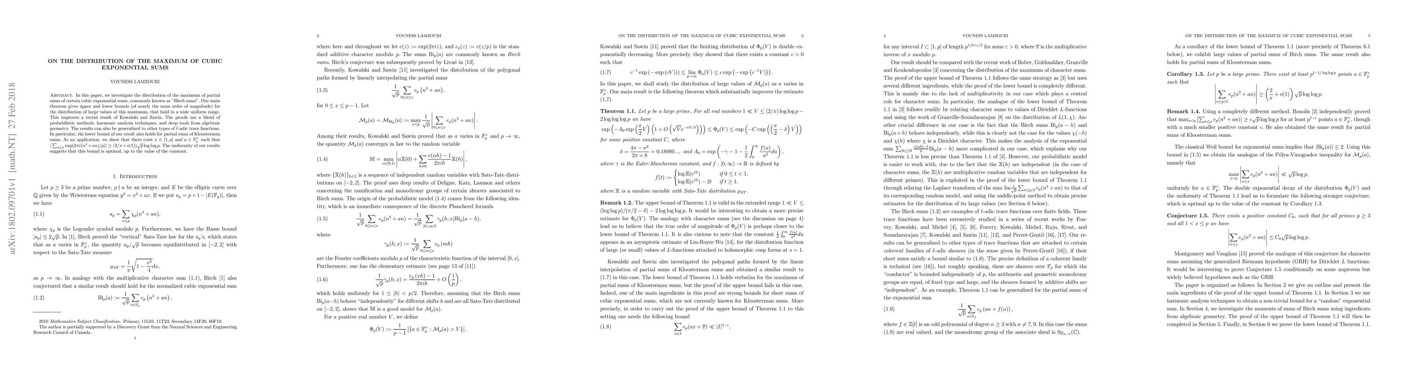 This paper provides upper and lower bounds for the distribution of the maximum of cubic exponential sums, known as "Birch sums," improving upon previous results. The results are shown to hold uniformly across a wide range and utilize probabilistic methods, harmonic analysis, and algebraic geometry, with applications to Kloosterman sums and evidence suggesting the optimality of the derived bounds.