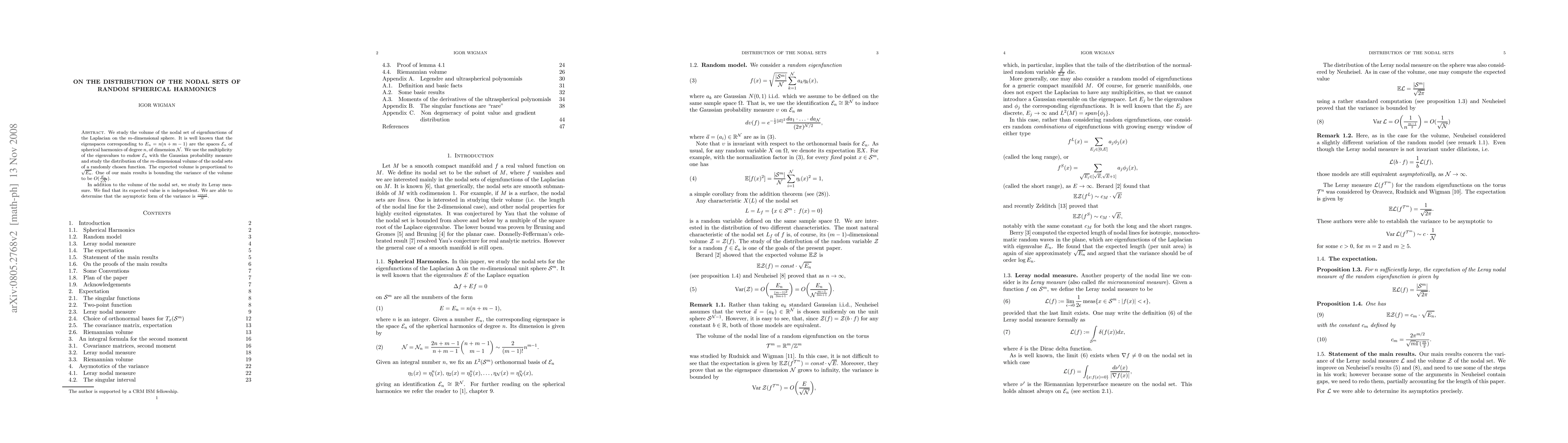 This paper investigates the distribution of nodal sets of random spherical harmonics on a $\spheredim$-dimensional sphere. It finds that the expected volume of these nodal sets is proportional to $\sqrt{\eigval}$, with the variance of the volume bounded as $O(\frac{\eigval}{\sqrt{\eigspcdim}})$. The study also examines the Leray measure, revealing an expected value of $\frac{1}{\sqrt{2\pi}}$ and a variance asymptotic to $\frac{const}{\eigspcdim}$.