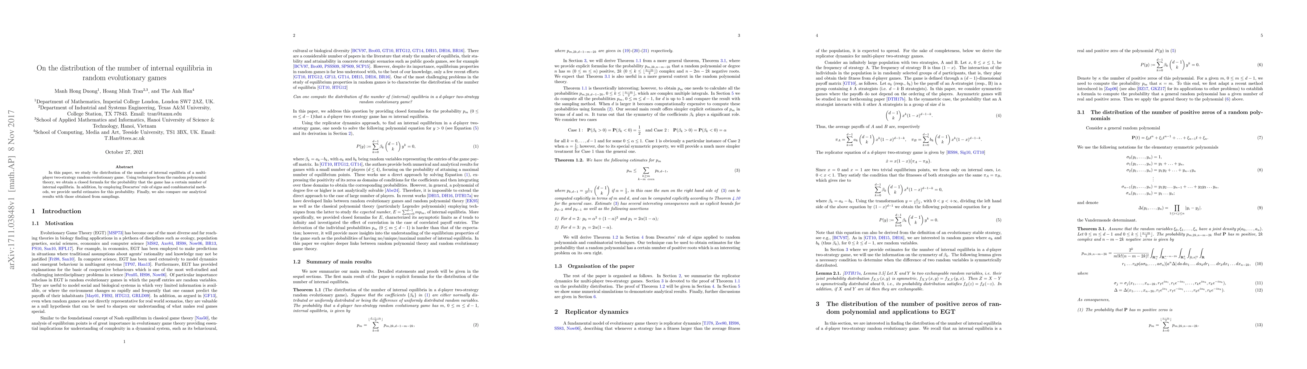This paper investigates the distribution of internal equilibria in multi-player two-strategy random evolutionary games, deriving a closed formula for the probability using random polynomial theory. It also employs Descartes' rule of signs and combinatorial methods to provide estimates and compares analytical results with empirical samplings.