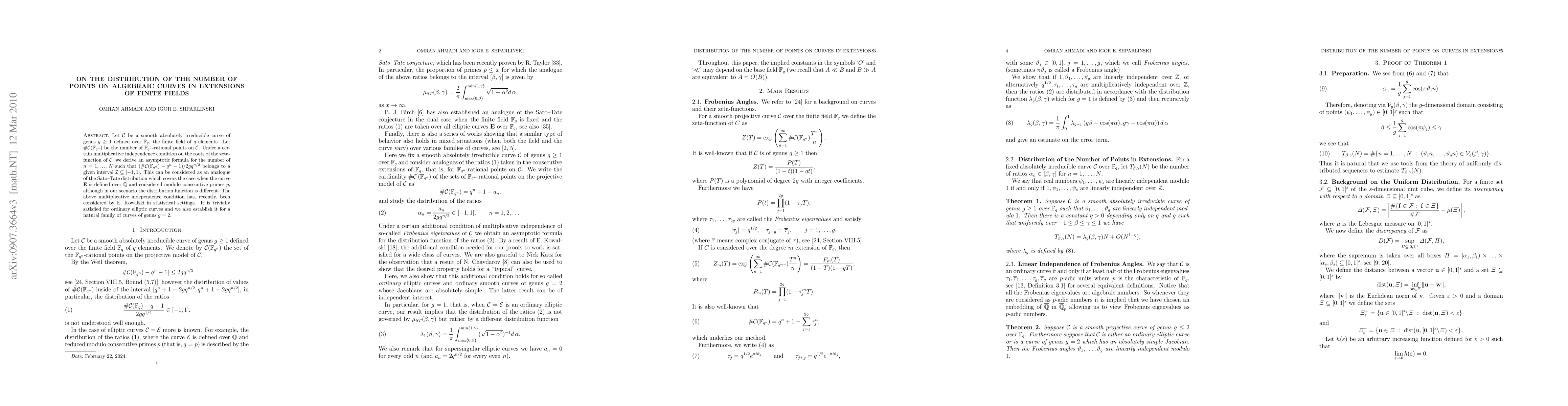 This paper derives an asymptotic formula for the number of points on a smooth algebraic curve over finite fields, under a multiplicative independence condition on the zeta-function's roots, analogous to the Sato-Tate distribution for elliptic curves over rational numbers. The condition is trivially satisfied for ordinary elliptic curves and established for a family of genus 2 curves.
