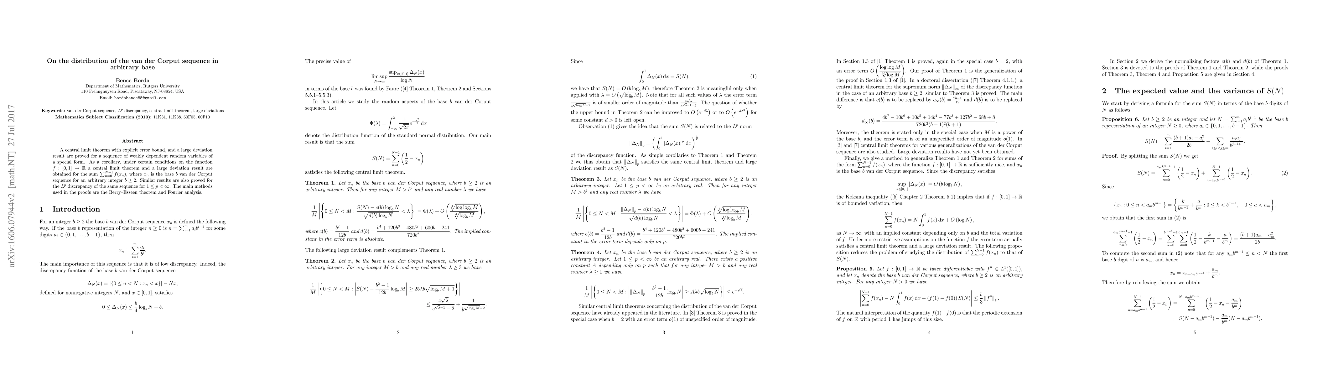 A central limit theorem with explicit error bound, and a large deviation result are proved for a sequence of weakly dependent random variables of a special form. As a corollary, under certain conditions on the function $f: [0,1] \to \mathbb{R}$ a central limit theorem and a large deviation result are obtained for the sum $\sum_{n=0}^{N-1} f(x_n)$, where $x_n$ is the base $b$ van der Corput sequence for an arbitrary integer $b \ge 2$. Similar results are also proved for the $L^p$ discrepancy of the same sequence for $1 \le p < \infty$. The main methods used in the proofs are the Berry-Esseen theorem and Fourier analysis.
