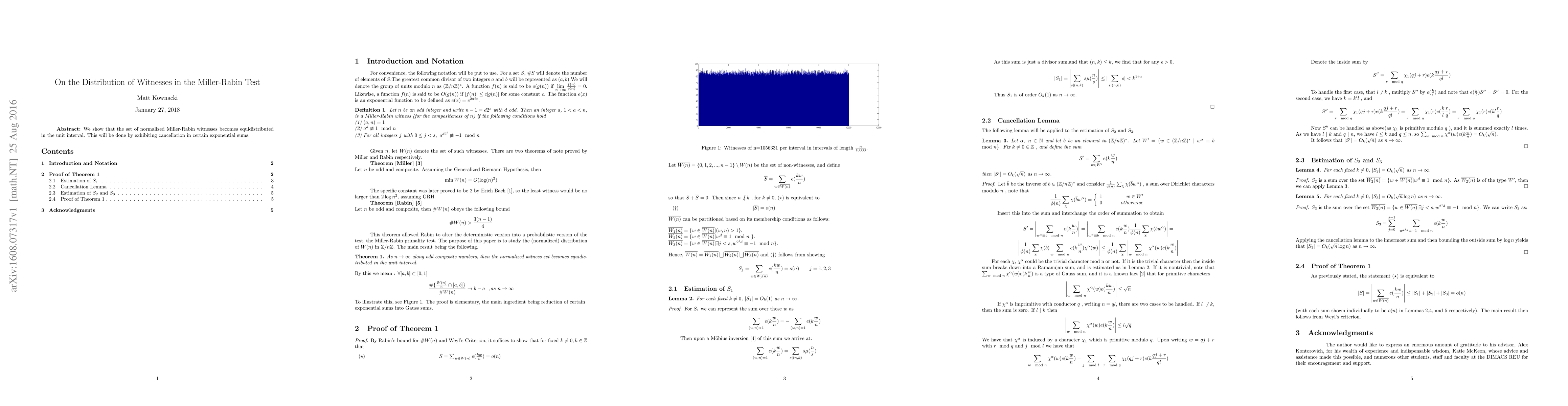 We show that the set of normalized Miller-Rabin witnesses becomes equidistributed in the unit interval. This will be done by exhibiting cancellation in certain exponential sums.