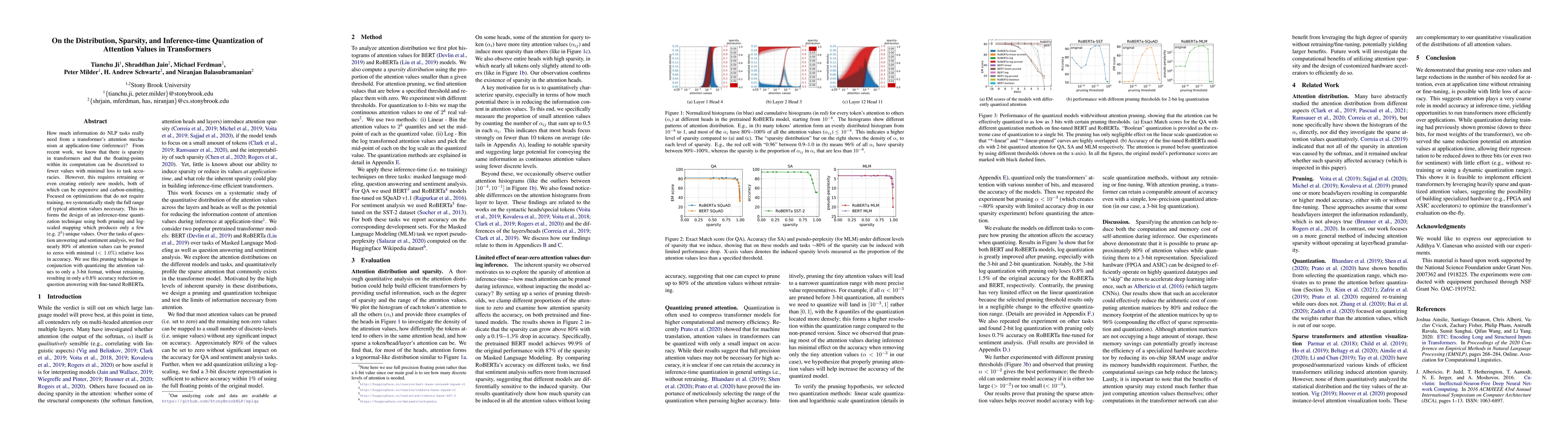 This paper investigates the optimization of transformer attention mechanisms through inference-time quantization, achieving minimal accuracy loss by pruning and quantizing attention values to a 3-bit format without retraining. It demonstrates that nearly 80% of attention values can be pruned with less than 1% relative loss, and quantizing remaining values to 3-bits results in only a 0.8% accuracy reduction on question answering tasks.