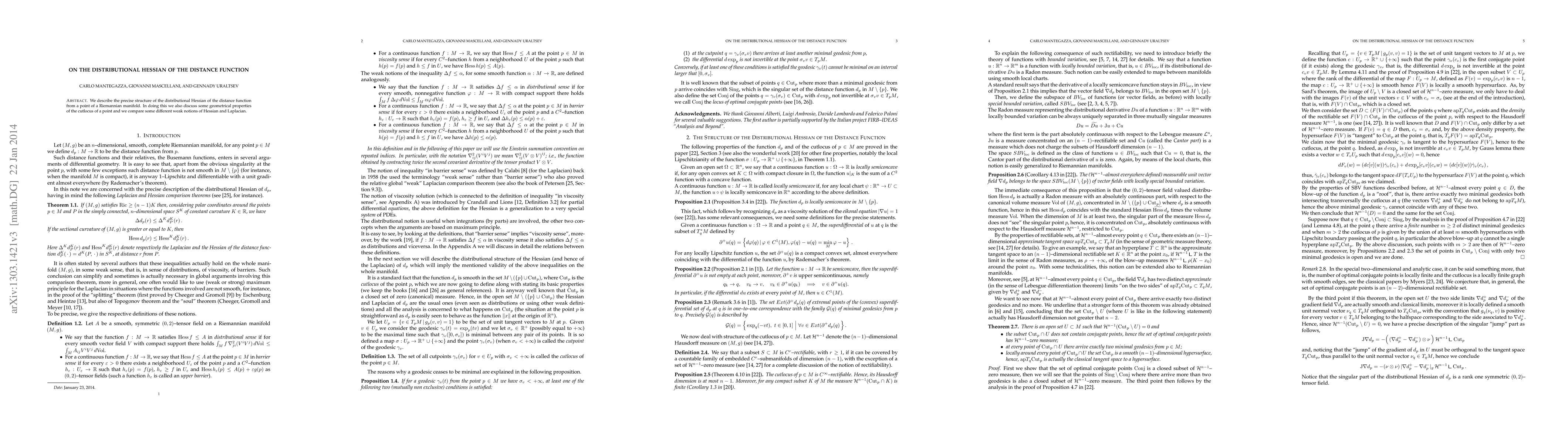 This paper investigates the distributional Hessian of the distance function on a Riemannian manifold, shedding light on its structure and comparing it to other notions of Hessian and Laplacian.