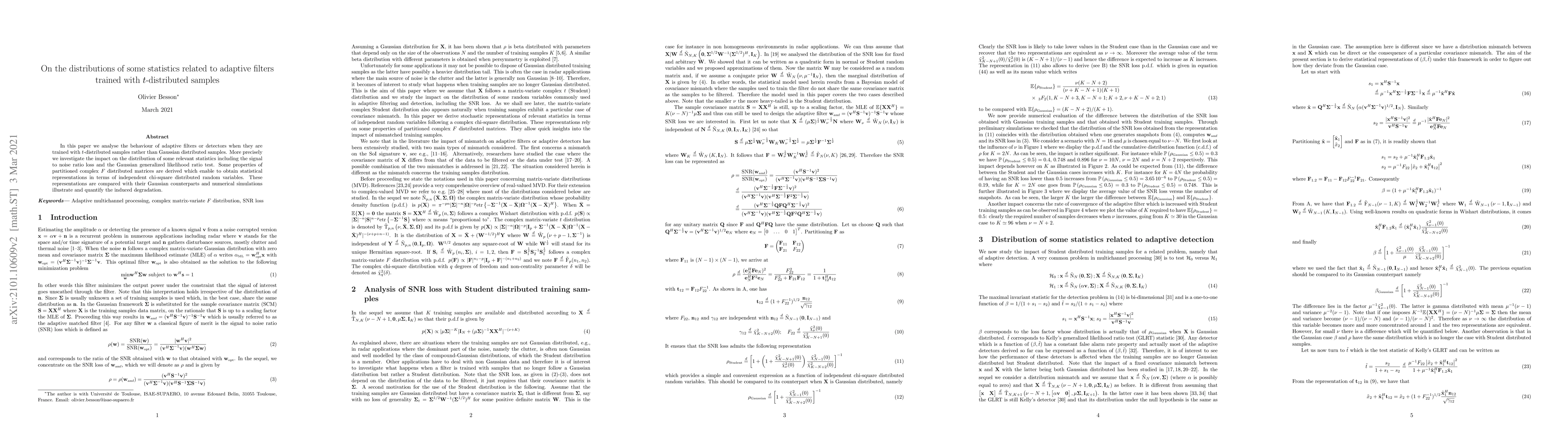 In this paper we analyse the behaviour of adaptive filters or detectors when they are trained with $t$-distributed samples rather than Gaussian distributed samples. More precisely we investigate the impact on the distribution of some relevant statistics including the signal to noise ratio loss and the Gaussian generalized likelihood ratio test. Some properties of partitioned complex $F$ distributed matrices are derived which enable to obtain statistical representations in terms of independent chi-square distributed random variables. These representations are compared with their Gaussian counterparts and numerical simulations illustrate and quantify the induced degradation.