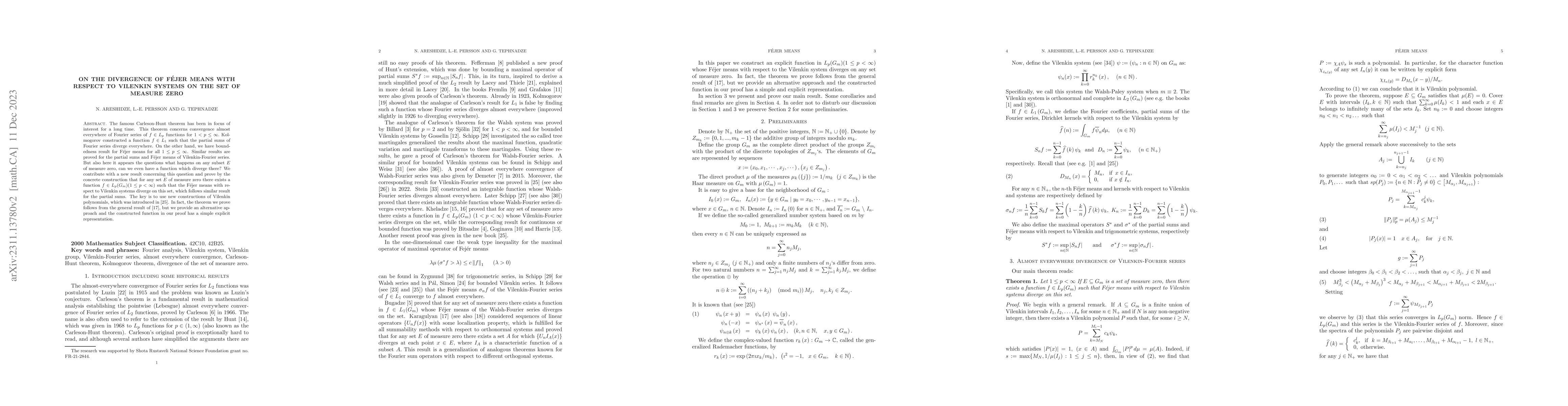 This paper investigates the divergence of F\'ejer means concerning Vilenkin systems on sets of measure zero. It constructs a function in $L_p(G_m)$ for which the F\'ejer means diverge on any given set $E$ of measure zero, extending similar results for Fourier series. The study employs new Vilenkin polynomial constructions and provides an explicit representation of the function.