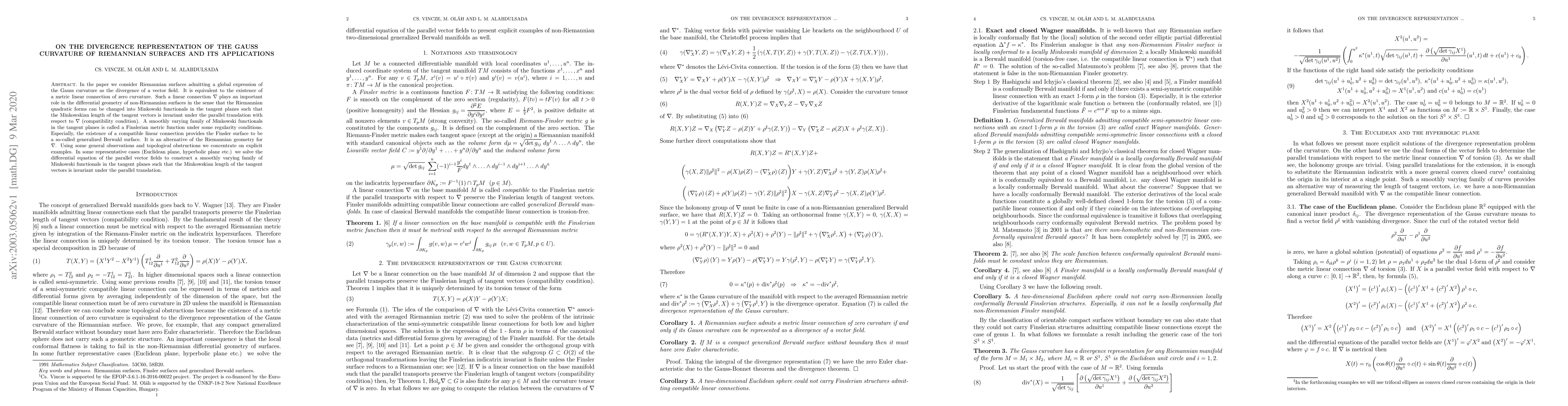 In the paper we consider Riemannian surfaces admitting a global expression of the Gauss curvature as the divergence of a vector field. It is equivalent to the existence of a metric linear connection of zero curvature. Such a linear connection $\nabla$ plays an important role in the differential geometry of non-Riemannian surfaces in the sense that the Riemannian quadratic forms can be changed into Minkowski functionals in the tangent planes such that the Minkowskian length of the tangent vectors is invariant under the parallel translation with respect to $\nabla$ (compatibility condition). A smoothly varying family of Minkowski functionals in the tangent planes is called a Finslerian metric function under some regularity conditions. Especially, the existence of a compatible linear connection provides the Finsler surface to be a so-called generalized Berwald surface. It is an alternative of the Riemannian geometry for $\nabla$. Using some general observations and topological obstructions we concentrate on explicit examples. In some representative cases (Euclidean plane, hyperbolic plane etc.) we solve the differential equation of the parallel vector fields to construct a smoothly varying family of Minkowski functionals in the tangent planes such that the Minkowskian length of the tangent vectors is invariant under the parallel translation.