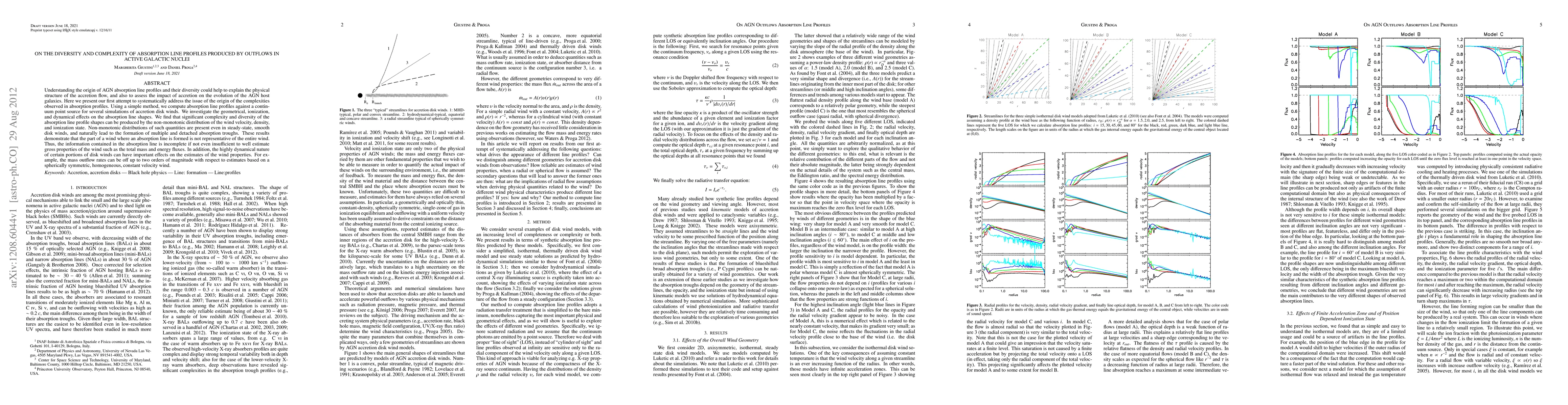 Understanding the origin of AGN absorption line profiles and their diversity could help to explain the physical structure of the accretion flow, and also to assess the impact of accretion on the evolution of the AGN host galaxies. Here we present our first attempt to systematically address the issue of the origin of the complexities observed in absorption profiles. Using a simple method, we compute absorption line profiles against a continuum point source for several simulations of accretion disk winds. We investigate the geometrical, ionization, and dynamical effects on the absorption line shapes. We find that significant complexity and diversity of the absorption line profile shapes can be produced by the non-monotonic distribution of the wind velocity, density, and ionization state. Non-monotonic distributions of such quantities are present even in steady-state, smooth disk winds, and naturally lead to the formation of multiple and detached absorption troughs. These results demonstrate that the part of a wind where an absorption line is formed is not representative of the entire wind. Thus, the information contained in the absorption line is incomplete if not even insufficient to well estimate gross properties of the wind such as the total mass and energy fluxes. In addition, the highly dynamical nature of certain portions of disk winds can have important effects on the estimates of the wind properties. For example, the mass outflow rates can be off up to two orders of magnitude with respect to estimates based on a spherically symmetric, homogeneous, constant velocity wind.