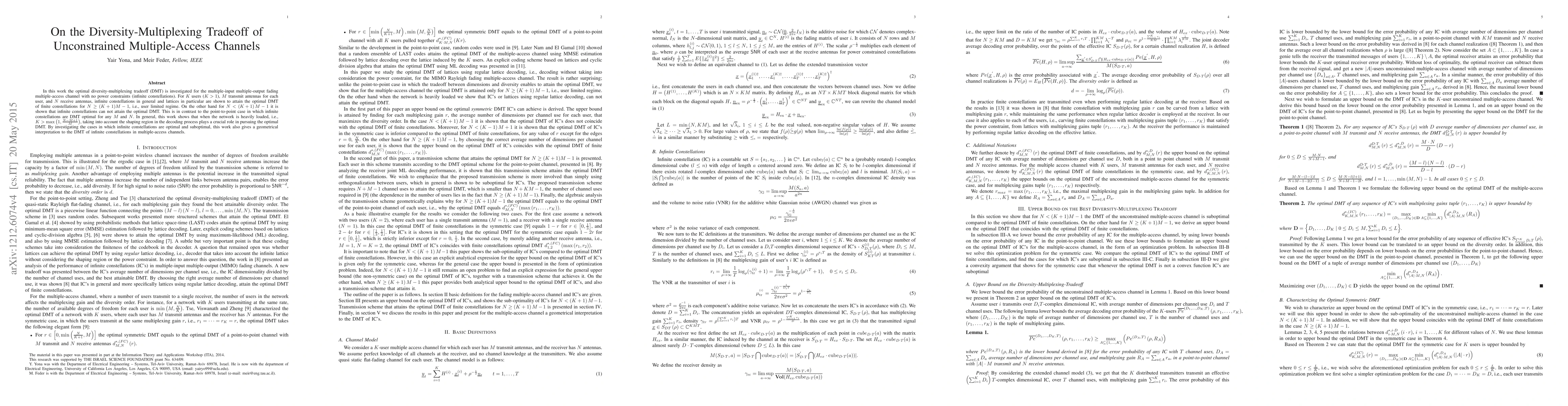 In this work the optimal diversity-multiplexing tradeoff (DMT) is investigated for the multiple-input multiple-output fading multiple-access channels with no power constraints (infinite constellations). For K users (K>1), M transmit antennas for each user, and N receive antennas, infinite constellations in general and lattices in particular are shown to attain the optimal DMT of finite constellations for the case N equals or greater than (K+1)M-1, i.e., user limited regime. On the other hand for N<(K+1)M-1 it is shown that infinite constellations can not attain the optimal DMT. This is in contrast to the point-to-point case in which infinite constellations are DMT optimal for any M and N. In general, this work shows that when the network is heavily loaded, i.e. K>max(1,(N-M+1)/M), taking into account the shaping region in the decoding process plays a crucial role in pursuing the optimal DMT. By investigating the cases where infinite constellations are optimal and suboptimal, this work also gives a geometrical interpretation to the DMT of infinite constellations in multiple-access channels.