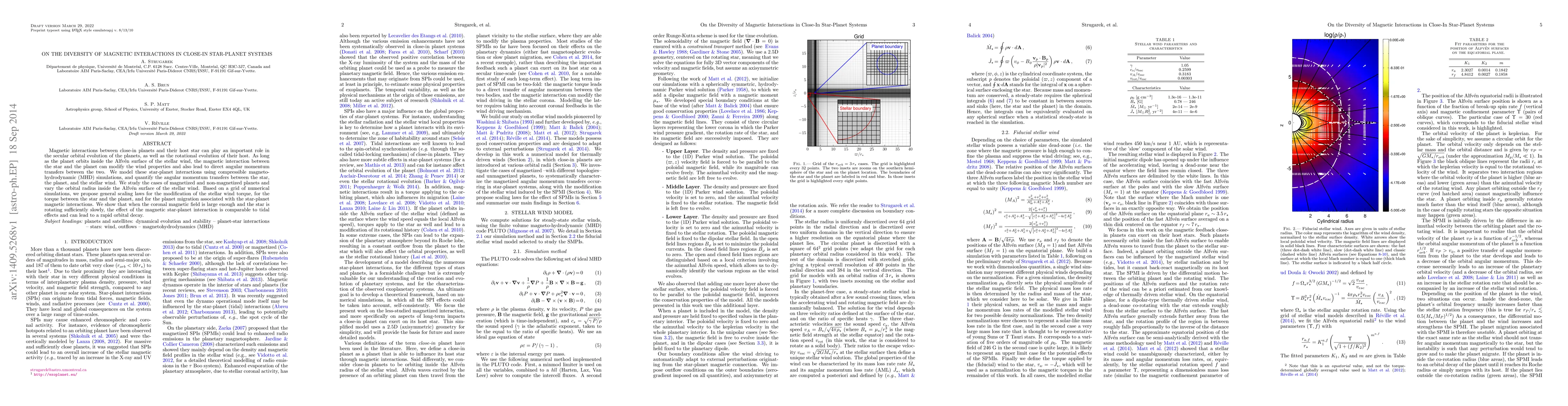 This paper investigates magnetic interactions between close-in planets and their host stars using MHD simulations, revealing significant angular momentum transfer and potential rapid orbital decay due to strong magnetic fields and slow stellar rotation. It proposes scaling laws for these interactions and highlights the role of magnetic fields in planet migration.