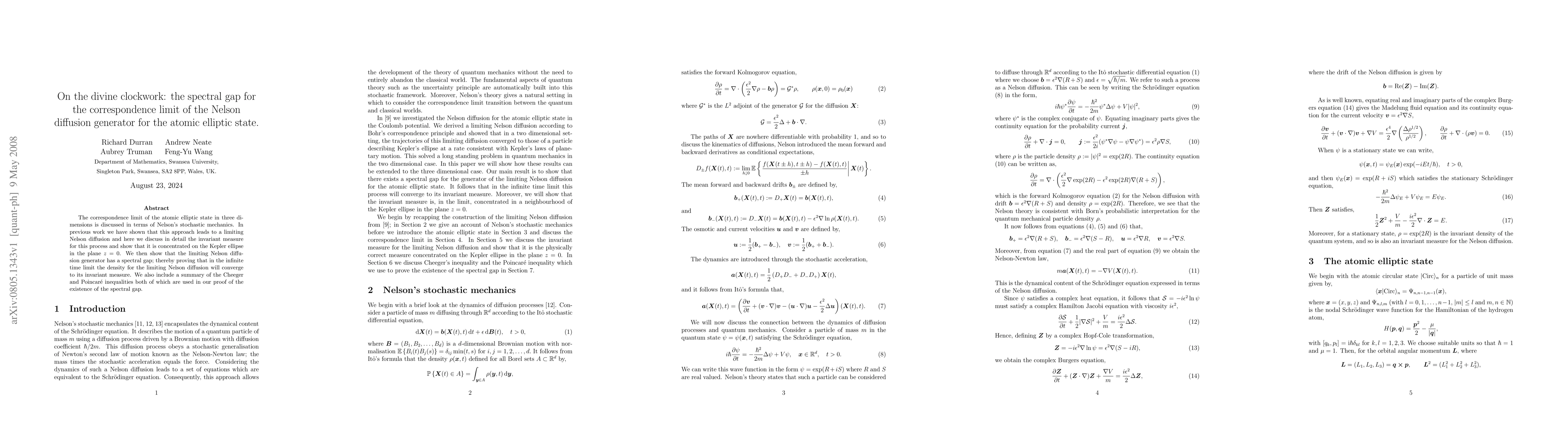 The correspondence limit of the atomic elliptic state in three dimensions is discussed in terms of Nelson's stochastic mechanics. In previous work we have shown that this approach leads to a limiting Nelson diffusion and here we discuss in detail the invariant measure for this process and show that it is concentrated on the Kepler ellipse in the plane z=0. We then show that the limiting Nelson diffusion generator has a spectral gap; thereby proving that in the infinite time limit the density for the limiting Nelson diffusion will converge to its invariant measure. We also include a summary of the Cheeger and Poincare inequalities both of which are used in our proof of the existence of the spectral gap.