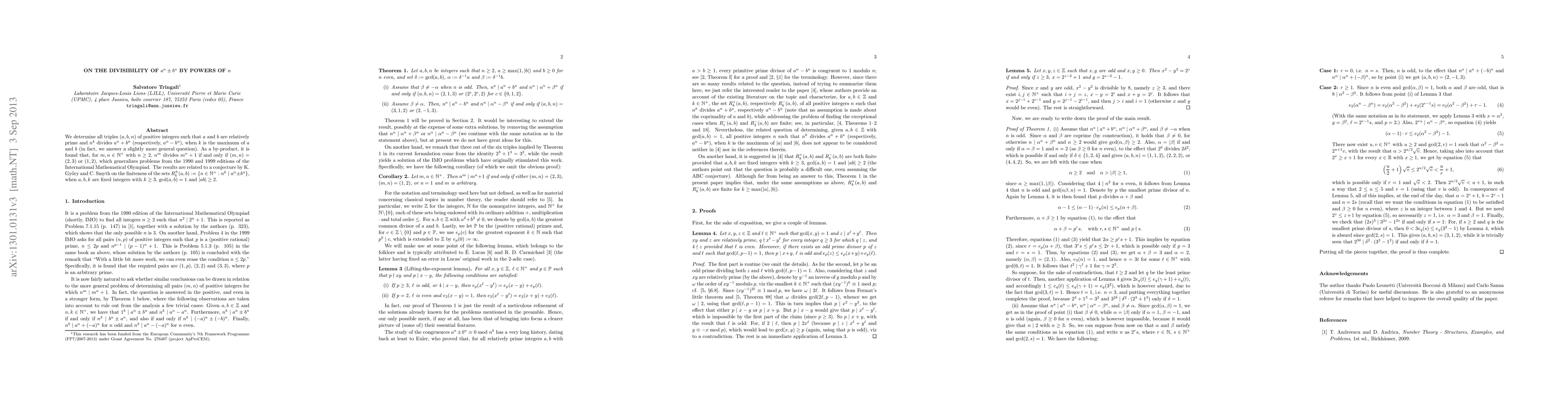 Researchers found that a^n ± b^n is divisible by n^k if and only if (a, b) = (2, 3) or (1, 2), for n >= 2. This resolves problems from the International Mathematical Olympiad.