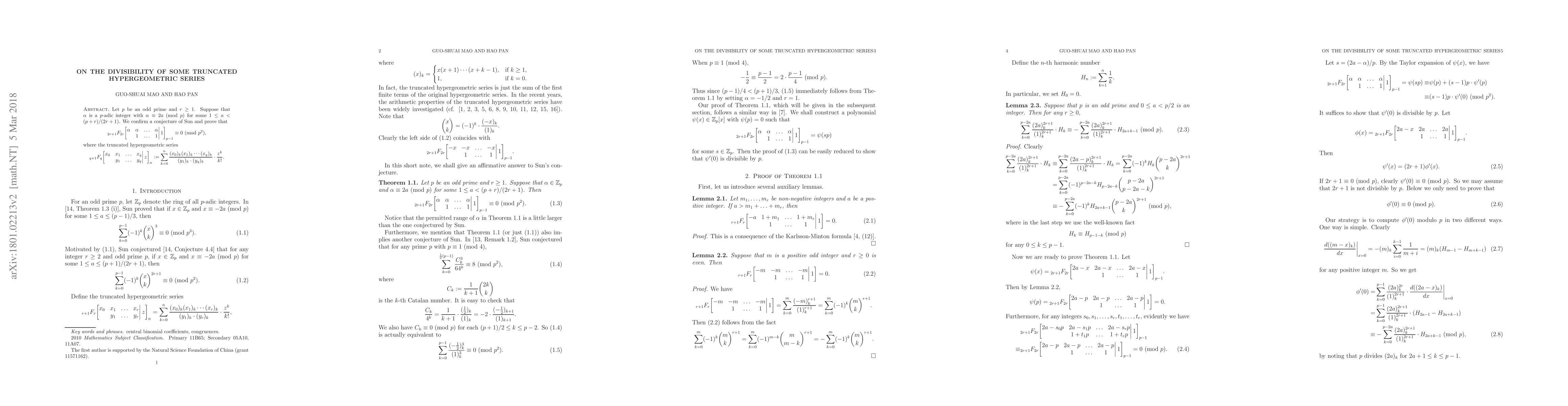 Let $p$ be an odd prime and $r\geq 1$. Suppose that $\alpha$ is a $p$-adic integer with $\alpha\equiv2a\pmod p$ for some $1\leq a<(p+r)/(2r+1)$. We confirm a conjecture of Sun and prove that $${}_{2r+1}F_{2r}\bigg[\begin{matrix}\alpha&\alpha&\ldots&\alpha\\ &1&\ldots&1\end{matrix}\bigg|\,1\bigg]_{p-1}\equiv0\pmod{p^2},$$ where the truncated hypergeometric series $$ {}_{q+1}F_{q}\bigg[\begin{matrix}x_0&x_1&\ldots&x_{q}\\ &y_1&\ldots&y_q\end{matrix}\bigg|\,z\bigg]_{n}:=\sum_{k=0}^n\frac{(x_0)_k(x_1)_k\cdots(x_q)_k}{(y_1)_k\cdot (y_q)_k}\cdot\frac{z^k}{k!}. $$