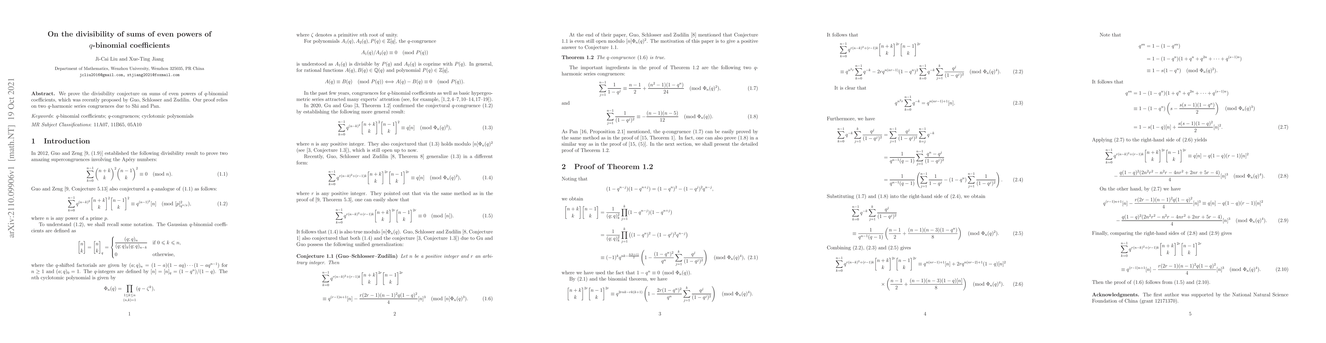 Summary: This paper proves the conjecture on the divisibility of sums of even powers of $q$-binomial coefficients using results from $q$-harmonic series congruences established by Shi and Pan. The conjecture was originally proposed by Guo, Schlosser, and Zudilin.