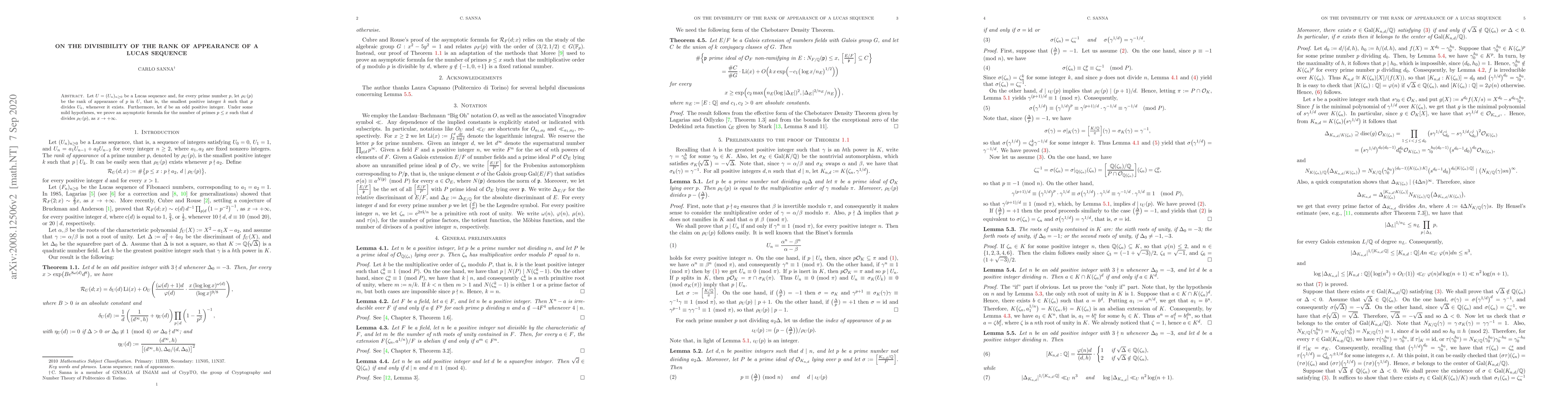 Let $U = (U_n)_{n \geq 0}$ be a Lucas sequence and, for every prime number $p$, let $\rho_U(p)$ be the rank of appearance of $p$ in $U$, that is, the smallest positive integer $k$ such that $p$ divides $U_k$, whenever it exists. Furthermore, let $d$ be an odd positive integer. Under some mild hypotheses, we prove an asymptotic formula for the number of primes $p \leq x$ such that $d$ divides $\rho_U(p)$, as $x \to +\infty$.