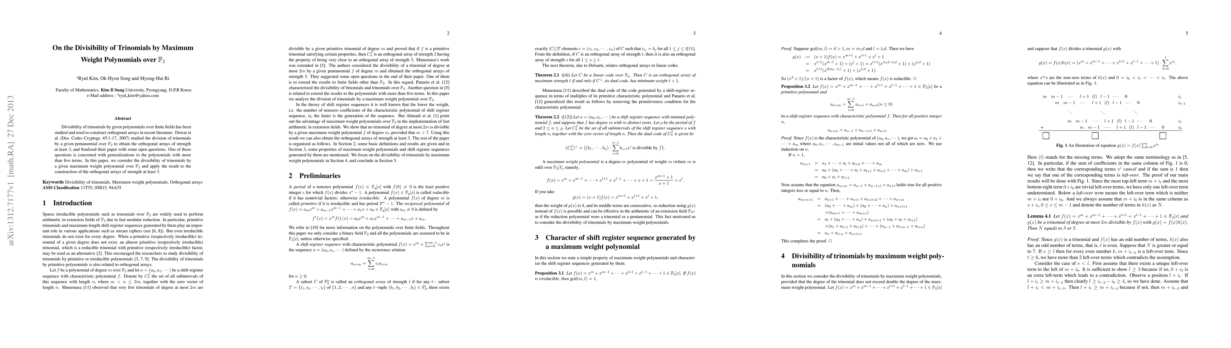 Divisibility of trinomials by given polynomials over finite fields has been studied and used to construct orthogonal arrays in recent literature. Dewar et al.\ (Des.\ Codes Cryptogr.\ 45:1-17, 2007) studied the division of trinomials by a given pentanomial over $\F_2$ to obtain the orthogonal arrays of strength at least 3, and finalized their paper with some open questions. One of these questions is concerned with generalizations to the polynomials with more than five terms. In this paper, we consider the divisibility of trinomials by a given maximum weight polynomial over $\F_2$ and apply the result to the construction of the orthogonal arrays of strength at least 3.