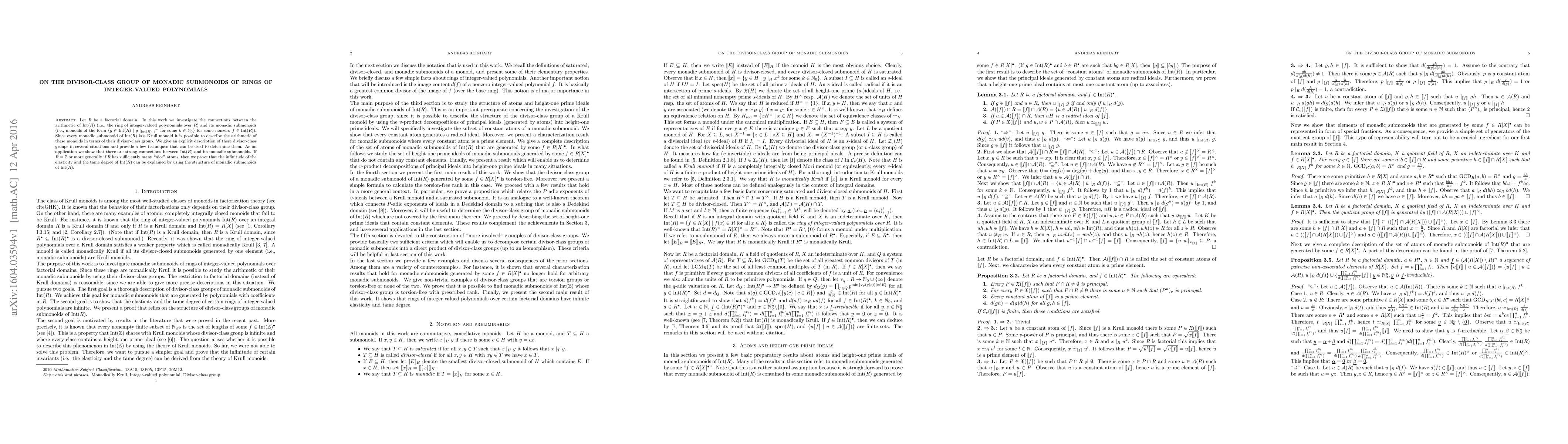 This paper explores the arithmetic connections between the ring of integer-valued polynomials over a factorial domain $R$ and its monadic submonoids, providing explicit descriptions of their divisor-class groups and demonstrating how these structures explain the infinitude of elasticity and tame degree in specific cases.