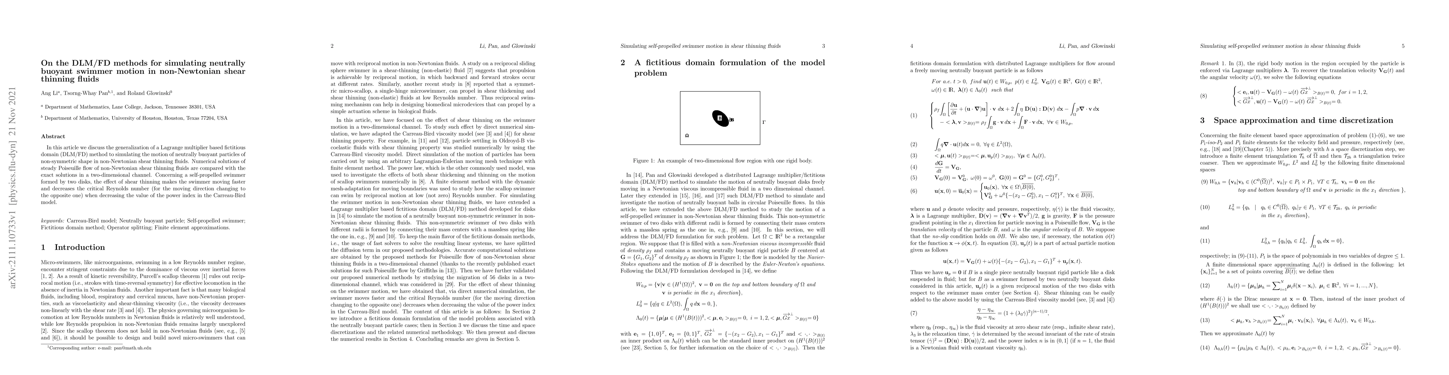 In this article we discuss the generalization of a Lagrange multiplier based fictitious domain (DLM/FD) method to simulating the motion of neutrally buoyant particles of non-symmetric shape in non-Newtonian shear thinning fluids. Numerical solutions of steady Poiseuille flow of non-Newtonian shear thinning fluids are compared with the exact solutions in a two-dimensional channel. Concerning a self-propelled swimmer formed by two disks, the effect of shear thinning makes the swimmer moving faster and decreases the critical Reynolds number (for the moving direction changing to the opposite one) when decreasing the value of the power index in the Carreau-Bird model.