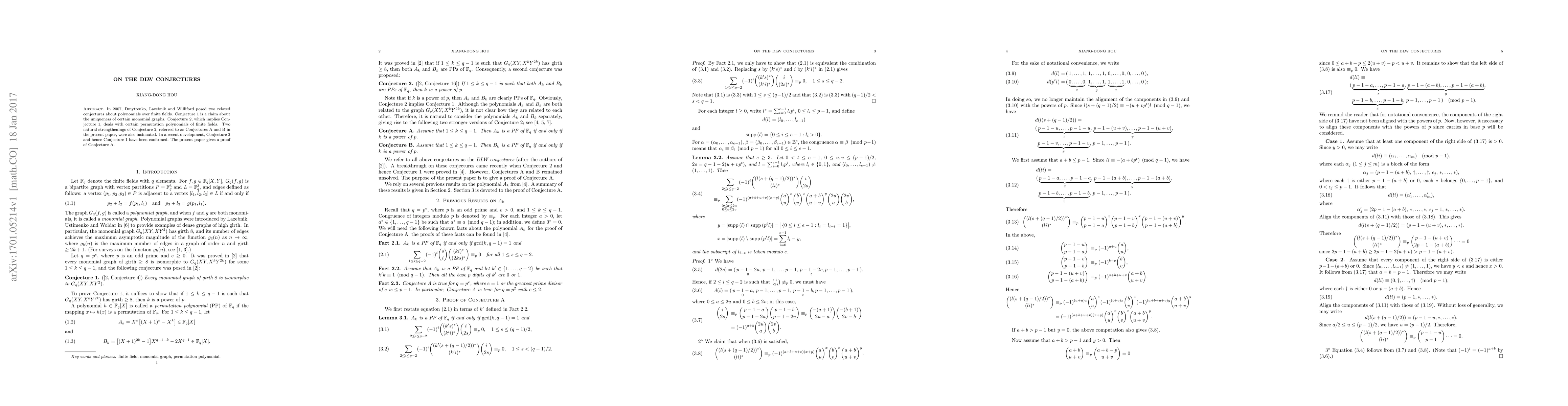 In 2007, Dmytrenko, Lazebnik and Williford posed two related conjectures about polynomials over finite fields. Conjecture~1 is a claim about the uniqueness of certain monomial graphs. Conjecture~2, which implies Conjecture~1, deals with certain permutation polynomials of finite fields. Two natural strengthenings of Conjecture~2, referred to as Conjectures~A and B in the present paper, were also insinuated. In a recent development, Conjecture~2 and hence Conjecture~1 have been confirmed. The present paper gives a proof of Conjecture~A.