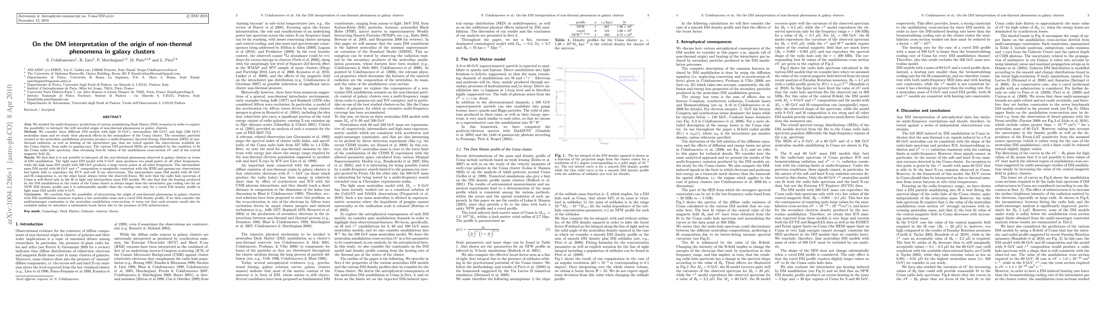 (Abridged) We study the predictions of various annihilating Dark Matter (DM) models in order to interpret the origin of non-thermal phenomena in galaxy clusters. We consider three neutralino DM models with light (9 GeV), intermediate (60 GeV) and high (500 GeV) mass. The secondary particles created by neutralino annihilation produce a multi-frequency Spectral Energy Distribution (SED), as well as heating of the intracluster gas, that are tested against the observations available for the Coma cluster. The DM produced SEDs are normalized to the Coma radio halo spectrum. We find that it is not possible to interpret all non-thermal phenomena observed in Coma in terms of DM annihilation. The DM model with 9 GeV mass produces too small power at all frequencies, while the DM model with 500 GeV produces a large excess power at all frequencies. The DM model with 60 GeV and $\tau^{\pm}$ composition is consistent with the HXR and gamma-ray data but fails to reproduce the EUV and soft X-ray data. The DM model with 60 GeV and $b{\bar b}$ composition is always below the observed fluxes. The radio halo spectrum of Coma is well fitted only in the $b{\bar b}$ or light and intermediate mass DM models. The heating produced by DM annihilation in the center of Coma is always larger than the intracluster gas cooling rate for an NFW DM density profile and it is substantially smaller than the cooling rate only for a cored DM density profile in DM model with 9 GeV. We conclude that the possibility of interpreting the origin of non-thermal phenomena in galaxy clusters with DM annihilation models requires a low neutralino mass and a cored DM density profile. If we then consider the multimessenger constraints to the neutralino annihilation cross-section, it turns out that such scenario would also be excluded unless we introduce a substantial boost factor due to the presence of DM substructures.