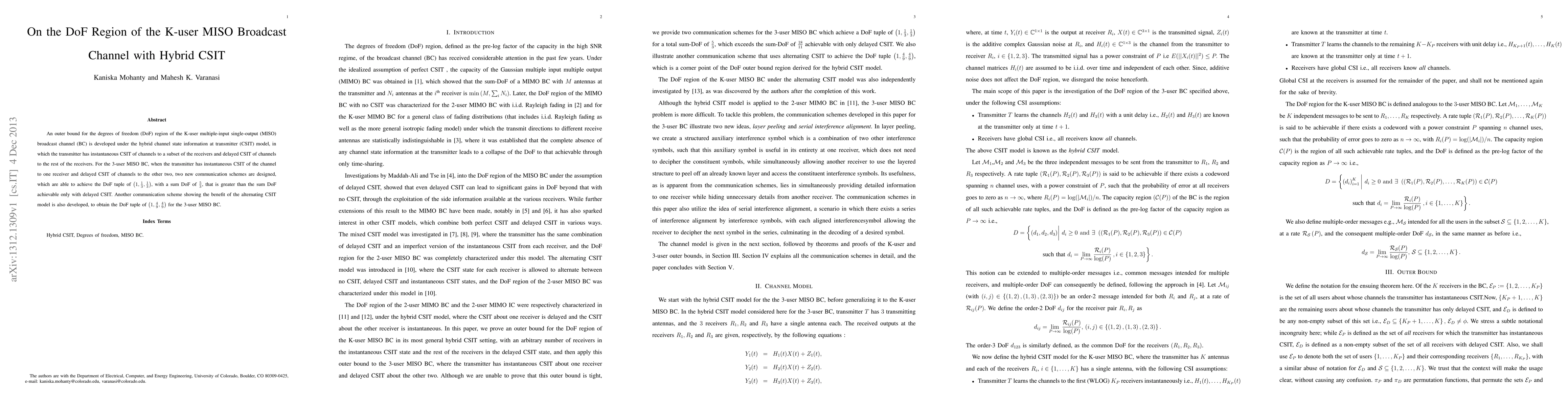 This paper develops an outer bound for the DoF region of a K-user MISO broadcast channel under hybrid CSIT, showing improved DoF tuples for a 3-user setup. It designs two new schemes achieving a sum DoF of $\frac{5}{3}$ and another scheme demonstrating the benefits of alternating CSIT.