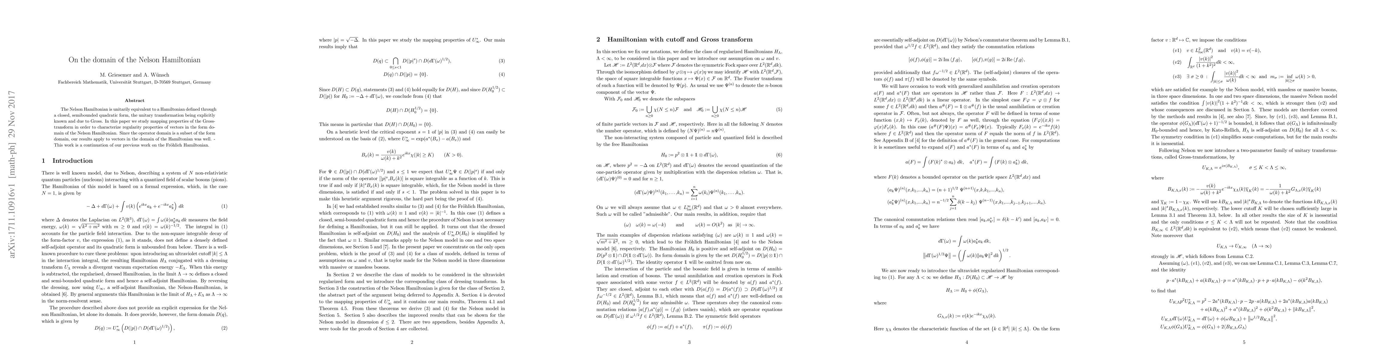The paper studies the domain of the Nelson Hamiltonian through mapping properties of the Gross transformation, characterizing regularity properties of vectors in the form domain, which applies to the Hamiltonian's domain as well.