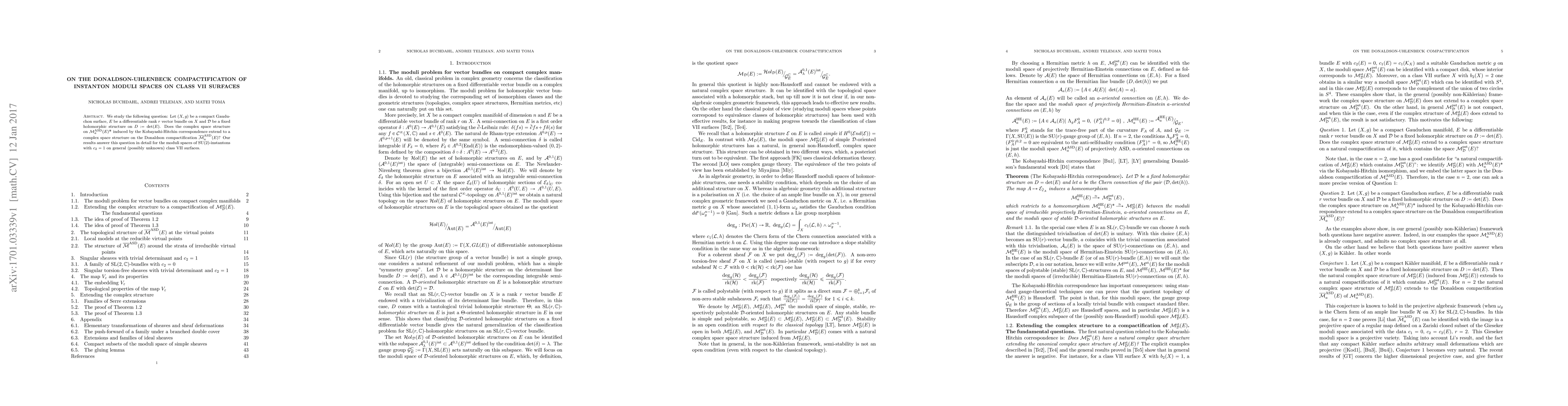 The paper's main technical contribution is the detailed analysis of the Donaldson-Uhlenbeck compactification process for instanton moduli spaces on class VII surfaces, providing a comprehensive understanding of the associated complex structures.