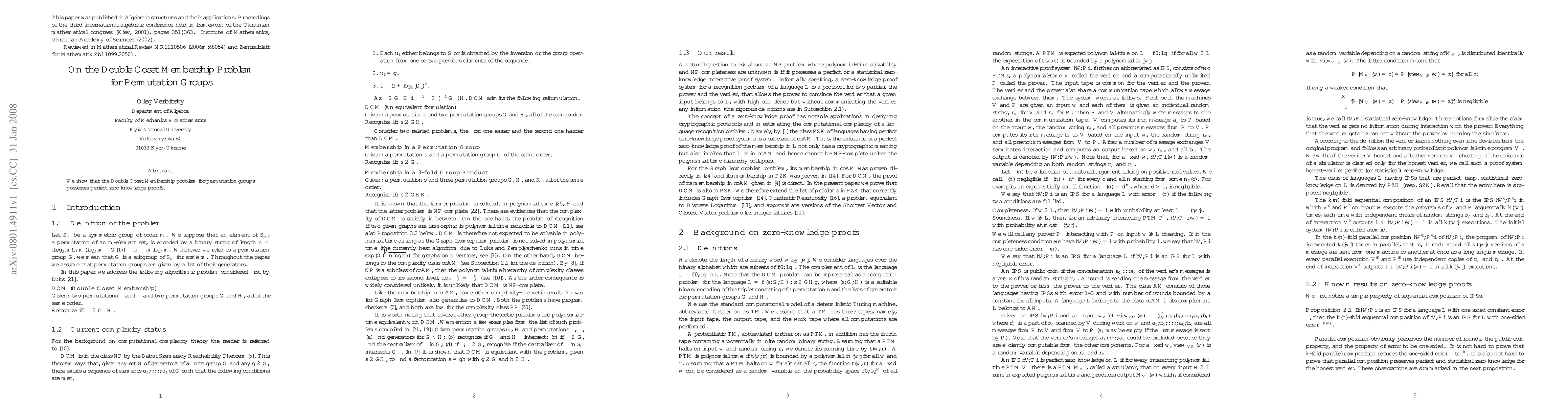 Summary: This paper demonstrates that the Double Coset Membership problem in permutation groups can be solved using perfect zero-knowledge proofs, enhancing the efficiency and security of related computations.
