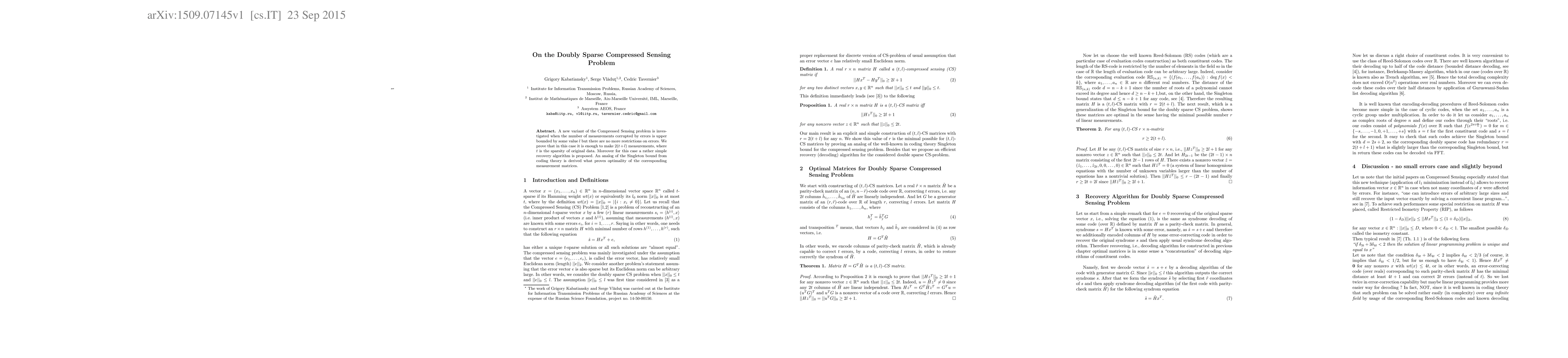 A new variant of the Compressed Sensing problem is investigated when the number of measurements corrupted by errors is upper bounded by some value l but there are no more restrictions on errors. We prove that in this case it is enough to make 2(t+l) measurements, where t is the sparsity of original data. Moreover for this case a rather simple recovery algorithm is proposed. An analog of the Singleton bound from coding theory is derived what proves optimality of the corresponding measurement matrices.