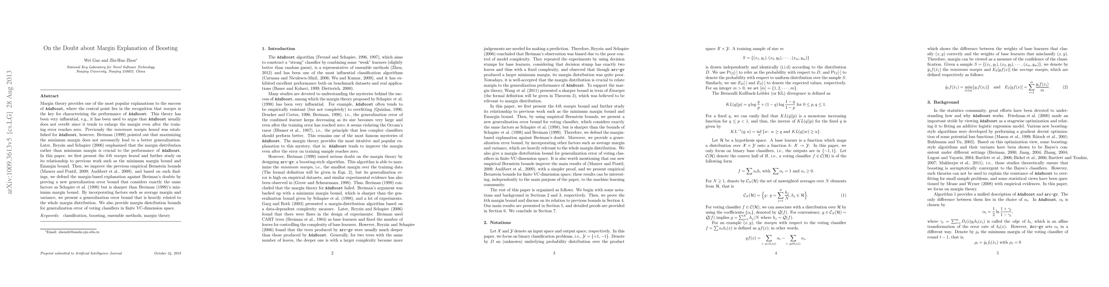 Margin theory provides one of the most popular explanations to the success of \texttt{AdaBoost}, where the central point lies in the recognition that \textit{margin} is the key for characterizing the performance of \texttt{AdaBoost}. This theory has been very influential, e.g., it has been used to argue that \texttt{AdaBoost} usually does not overfit since it tends to enlarge the margin even after the training error reaches zero. Previously the \textit{minimum margin bound} was established for \texttt{AdaBoost}, however, \cite{Breiman1999} pointed out that maximizing the minimum margin does not necessarily lead to a better generalization. Later, \cite{Reyzin:Schapire2006} emphasized that the margin distribution rather than minimum margin is crucial to the performance of \texttt{AdaBoost}. In this paper, we first present the \textit{$k$th margin bound} and further study on its relationship to previous work such as the minimum margin bound and Emargin bound. Then, we improve the previous empirical Bernstein bounds \citep{Maurer:Pontil2009,Audibert:Munos:Szepesvari2009}, and based on such findings, we defend the margin-based explanation against Breiman's doubts by proving a new generalization error bound that considers exactly the same factors as \cite{Schapire:Freund:Bartlett:Lee1998} but is sharper than \cite{Breiman1999}'s minimum margin bound. By incorporating factors such as average margin and variance, we present a generalization error bound that is heavily related to the whole margin distribution. We also provide margin distribution bounds for generalization error of voting classifiers in finite VC-dimension space.