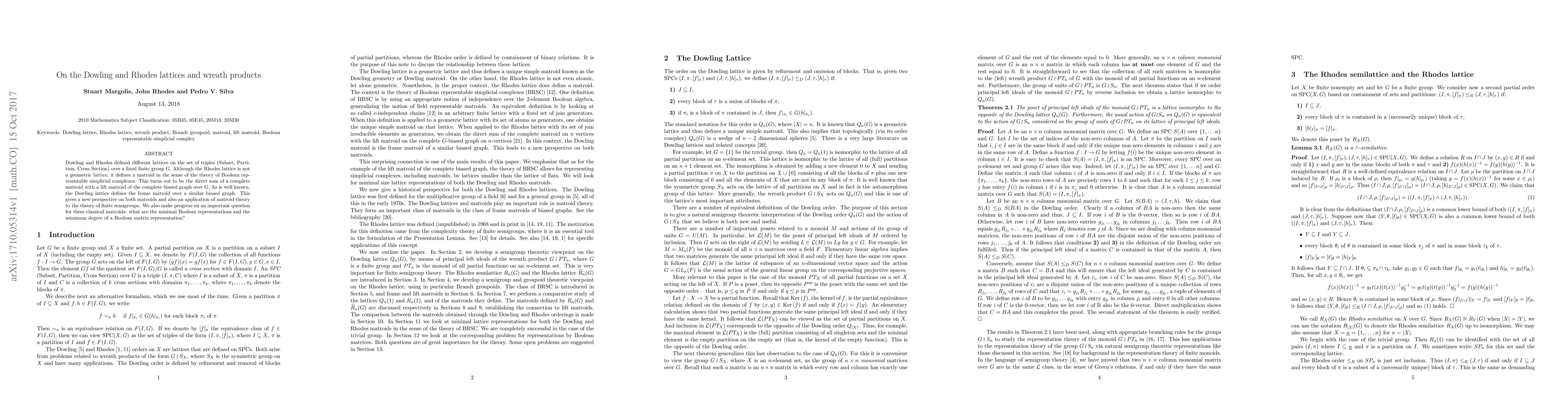 Dowling and Rhodes defined different lattices on the set of triples (Subset, Partition, Cross Section) over a fixed finite group G. Although the Rhodes lattice is not a geometric lattice, it defines a matroid in the sense of the theory of Boolean representable simplicial complexes. This turns out to be the direct sum of a complete matroid with a lift matroid of the complete biased graph over G. As is well known, the Dowling lattice defines the frame matroid over a similar biased graph. This gives a new perspective on both matroids and also an application of matroid theory to the theory of finite semigroups. We also make progress on an important question for these classical matroids: what are the minimal Boolean representations and the minimum degree of a Boolean matrix representation?