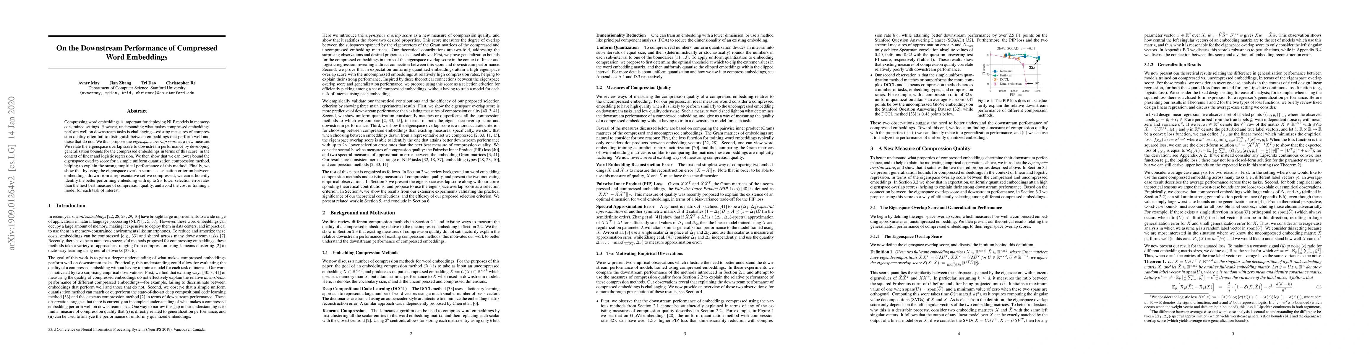 This paper proposes the eigenspace overlap score as a new measure to evaluate the performance of compressed word embeddings on downstream tasks. It demonstrates that this score correlates well with downstream performance and can efficiently identify high-performing embeddings without the need for task-specific model training.