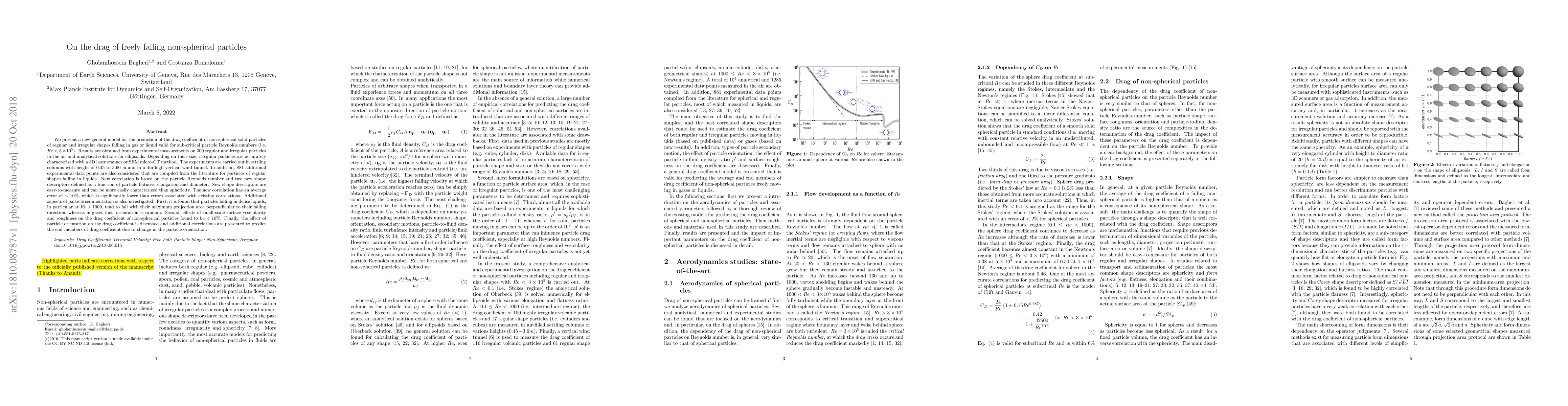 The paper presents a novel model to predict drag of non-spherical particles in fluids, using 3D scanning for shape characterization. Experiments in various columns and wind tunnels, plus literature data, led to new shape descriptors and correlation with ~10% error, outperforming existing models. The study also reveals that particle orientation in liquids tends towards maximum projection area perpendicular to falling direction at higher Reynolds numbers, and surface roughness/vesicularity has minimal impact (<10%) on drag coefficient.